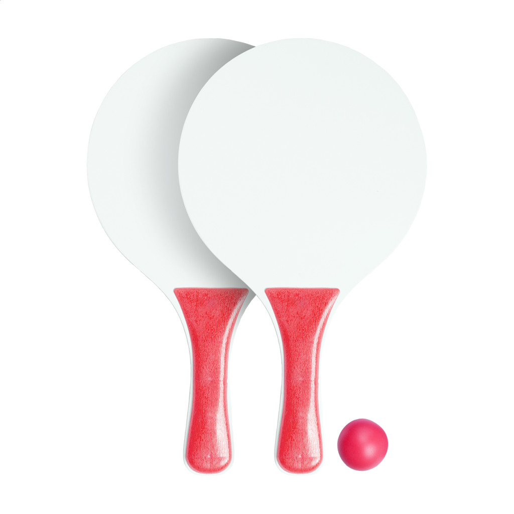 Fából készült strandjáték szett, 2 db ütőt és egy labdát tartalmaz.