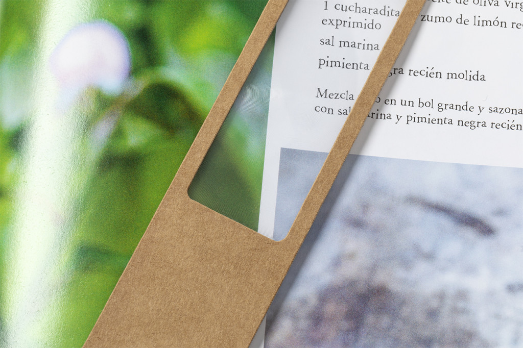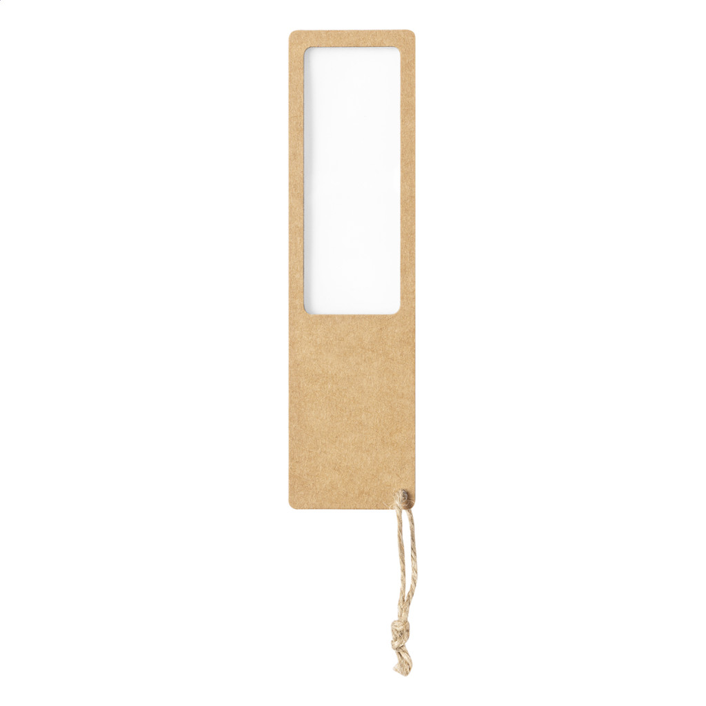 Újrahasznosított papír könyvjelző, nagyítós betéttel és zsinórral.