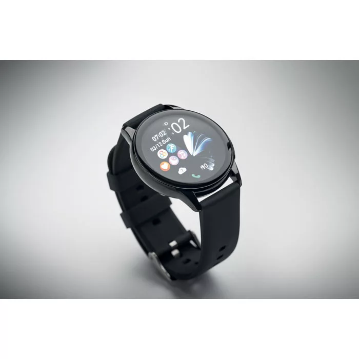 IP67 vízálló vezeték nélküli okosóra cink ötvözetből, szilikon szíjjal. 1.32 colos AMOLED érintőképernyő. Újratölthető 300 mAh lítium-polimer akkumulátor. iOS és Android rendszerre egyaránt ingyenesen elérhető alkalmazással (FitCloudPro) működik.