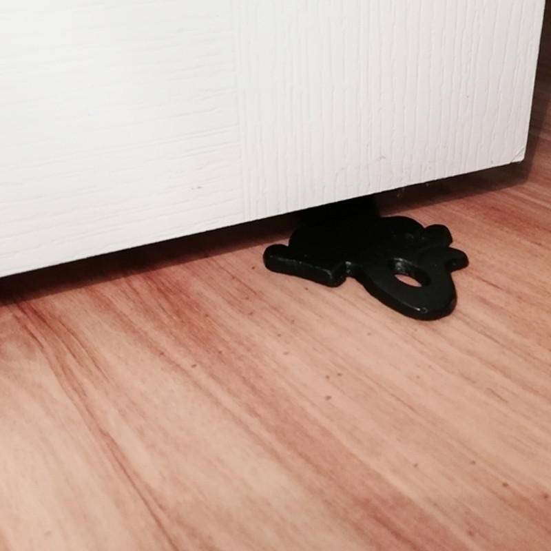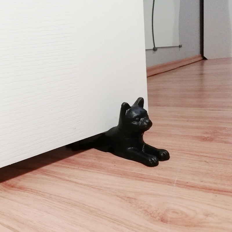Öntöttvas ajtókitámasztó cica formában, fekete színben. Nem csupán dekoratív lakáskiegészítő, de praktikus használati tárgy is, hiszen az ék segítségével bármilyen ajtó megtámasztható. Időtlen stílusának köszönhetően bármilyen környezetben jól mutat. Öntöttvas jellegéből adódóan, kinti használat esetén a korrózió megjelenésével egy patinásabb, rusztikusabb termék válik belőle.