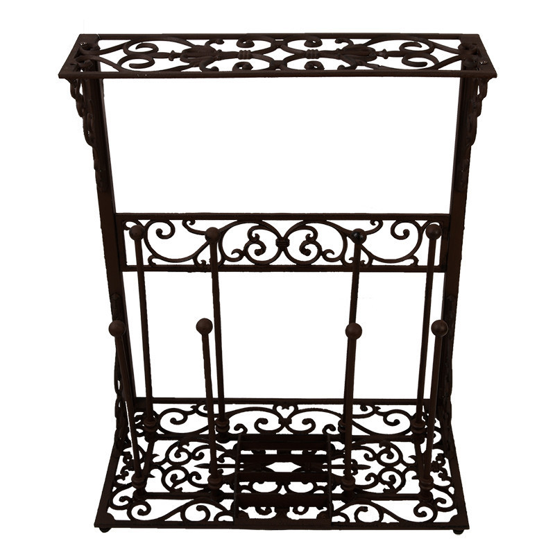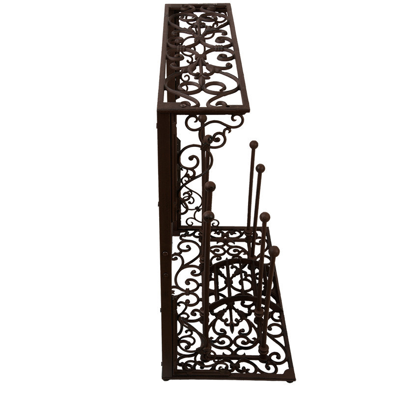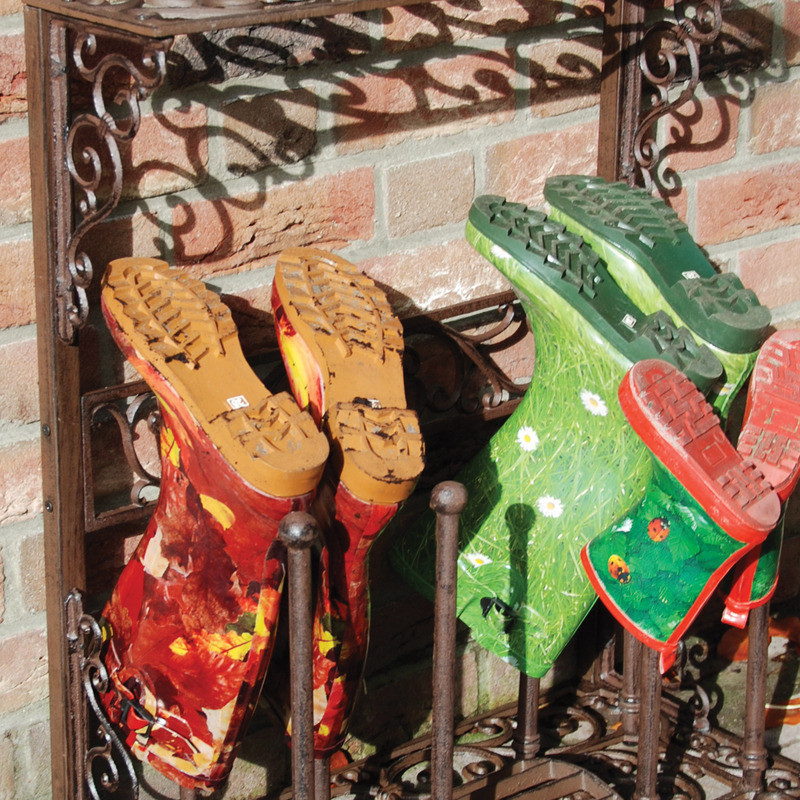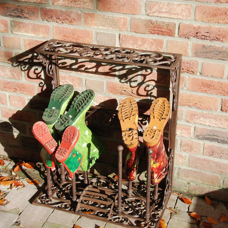 Ez a nagyméretű öntöttvas állvány segítséget nyújt csizmáink rendbetételekor és tárolásakor. Középső részén egy praktikus sárkaparót találunk, jobb és bal oldalára pedig egy-egy pár csizmát húzhatunk fel. Az állvány tetejére kisebb használati tárgyakat, virágokat, dekorációkat helyezhetünk. A termék látványos eleme lehet otthonunknak, kifejezetten ajánljuk gyakran kertészkedőknek. Az alján négy gumi láb biztosítja, hogy benti használat során ne karcolódjon össze a padlónk. Öntöttvas jellegéből adódóan külső elhelyezés esetén, a korrózió megjelenésével egy patinásabb, rusztikusabb termék válik belőle. Tisztítása egyszerű, a termék antik barna színben kapható.