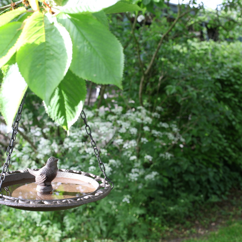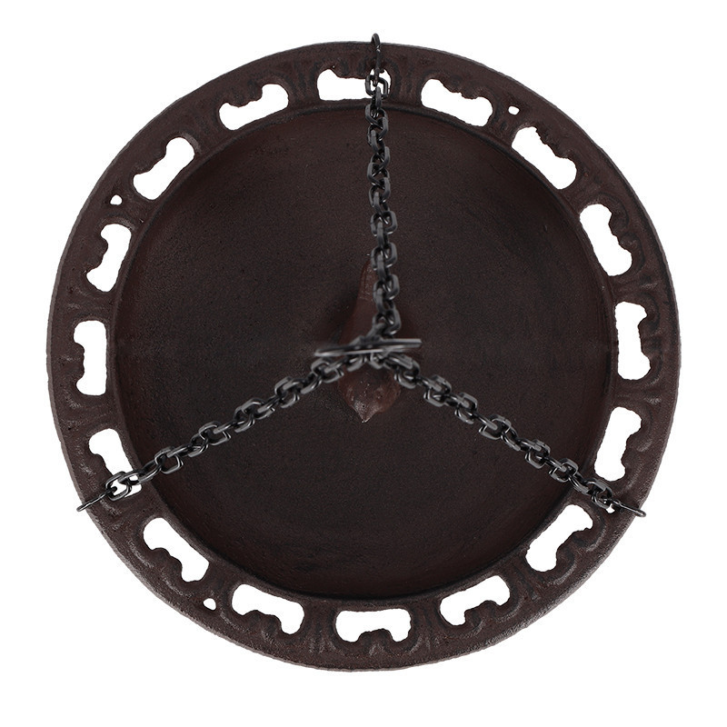 Öntöttvas felakasztható madáretető és -itató, kismadár dekorációval, 23 cm átmérőjű