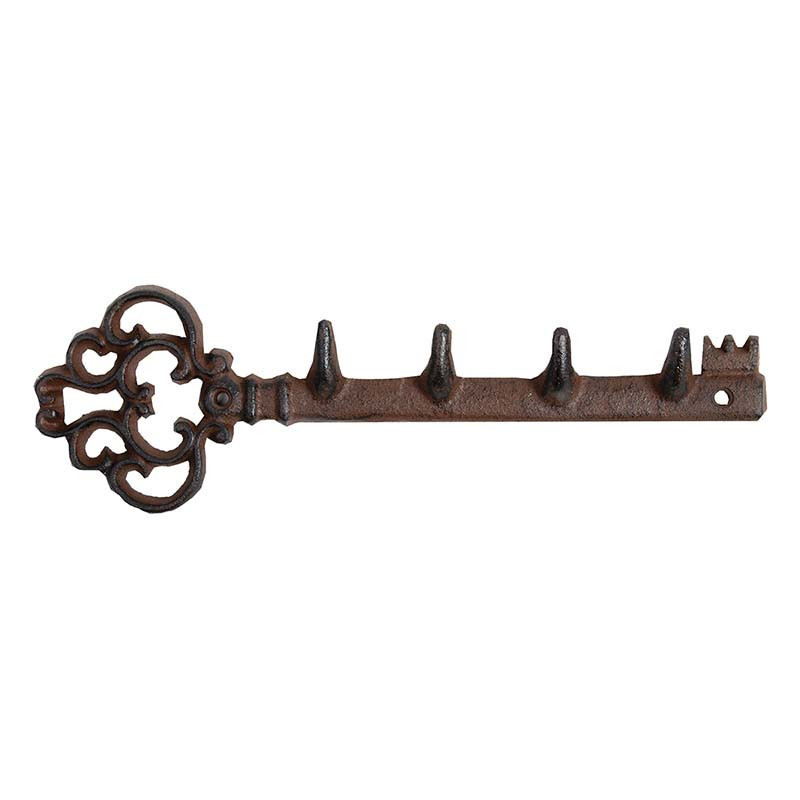 Klasszikus stílusú öntöttvas, négy fogasos akasztó kulcsot formáló mintával, különleges kialakítással. Dekoratív darab, kifinomult kidolgozás jellemzi. A fogas stílusosan mutat az előszobában, a hálószobában, a fürdőszobában vagy akár a kertben is. Benti használat során kulcsok, sálak, kabátok, táskák, konyhai textilek vagy egyéb ruhadarabok elhelyezésére is tökéletes. Kinti használat alkalmával akasszuk rá kisebb kerti eszközeinket. Öntöttvas jellegéből adódóan, külső elhelyezés esetén a korrózió megjelenésével egy patinásabb, rusztikusabb termék válik belőle. Az akasztó antik barna színben kapható, a falra könnyen felszerelhető. TIPP: A felszereléshez szükséged lesz az ehhez megfelelő kiképzésű csavarra is. A termék a csavart nem tartalmazza.