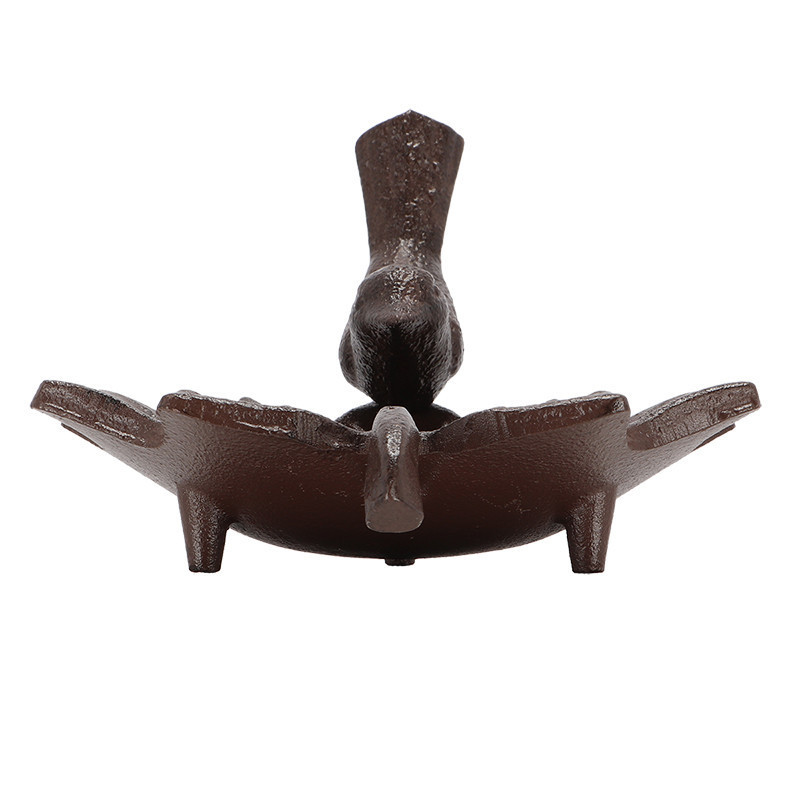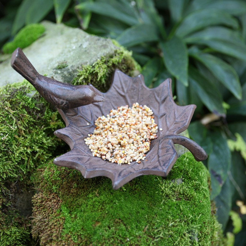 Levél formájú, vidékies hangulatot árasztó öntöttvas madáritató,- és etető tál kismadár díszítéssel. Az etetés könnyebbséget és biztonságot jelent a környék madarainak, akik madárcsicsergéssel hálálják meg a gondoskodást. Öntöttvas jellegéből adódóan külső elhelyezés esetén, a korrózió megjelenésével egy patinásabb, rusztikusabb termék válik belőle. Nem csupán pompás kerti dekoráció, de hasznos a madaraink védelmében is.