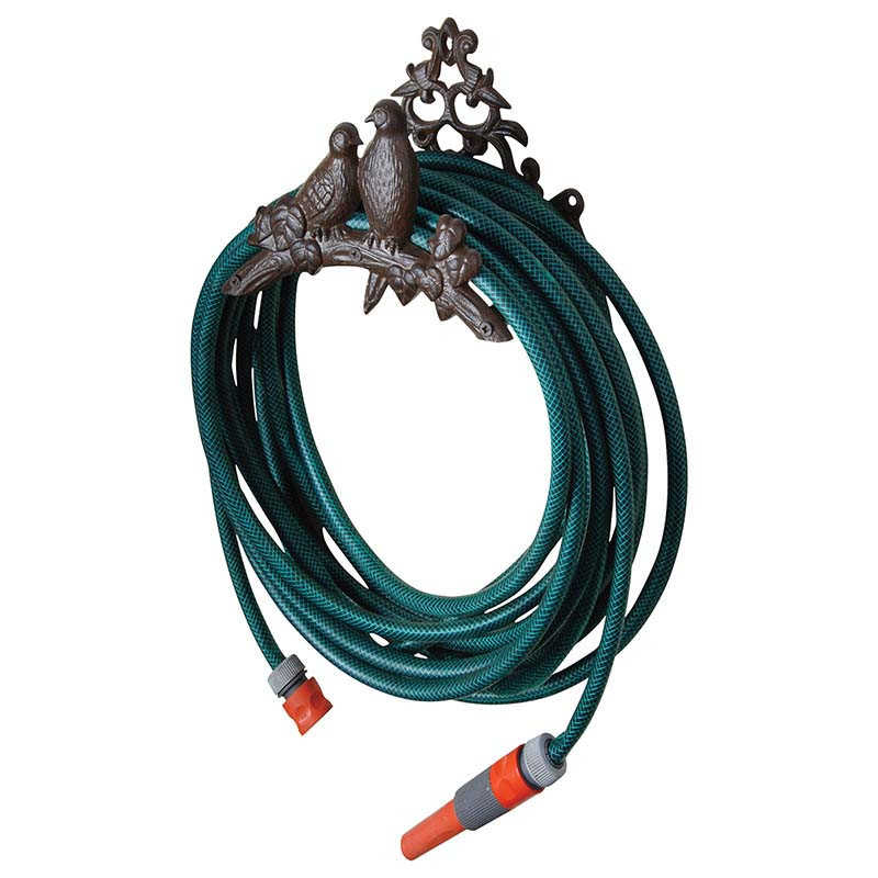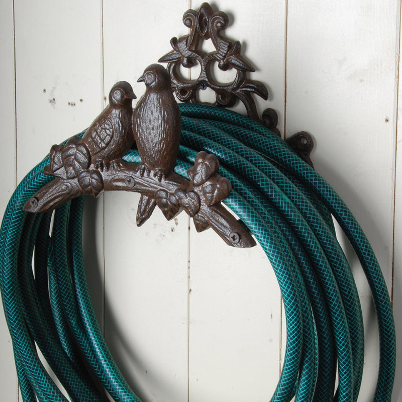 Rusztikus stílusú öntöttvas kerti tömlőtartó kismadár mintával. Különleges megjelenésű darab, amely pompásan mutat minden udvarban. Használat után mindig tekerjük rá vissza a locsolótömlőt, így sosem lesz útban. Öntöttvas jellegéből adódóan külső elhelyezés esetén, a korrózió megjelenésével egy patinásabb, rusztikusabb termék válik belőle. A termék antik barna színben kapható, a falra könnyen felszerelhető.TIPP: A felszereléshez szükséged lesz az ehhez megfelelő kiképzésű csavarra is. A termék a csavart nem tartalmazza.