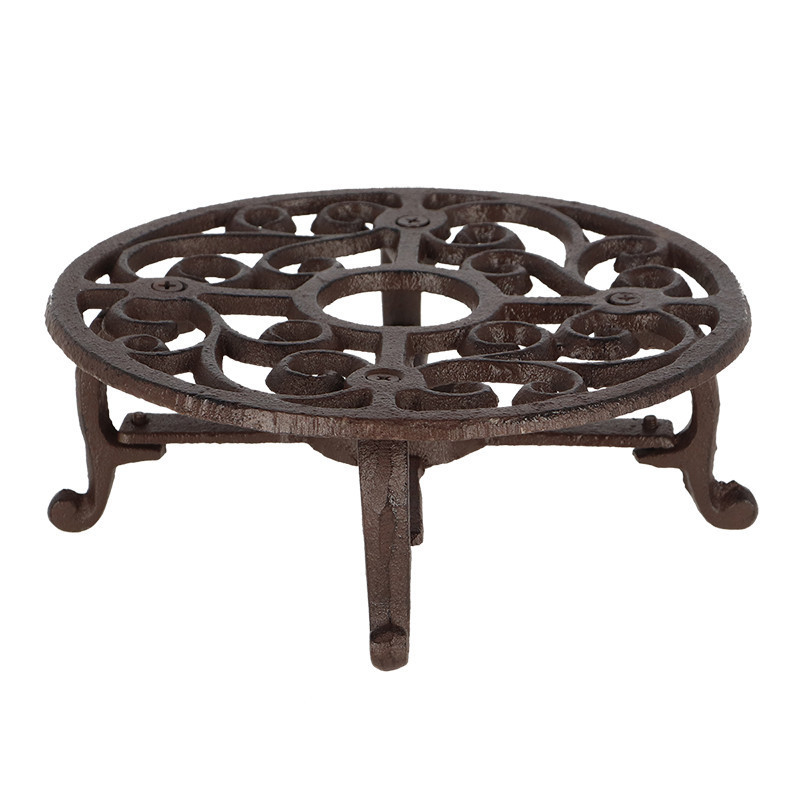 Rusztikus stílusú, kör alakú öntöttvas teáskanna melegítő, teamécses tartóval. Nem csupán praktikus kellék, de egyedi dekoráció is. A hűvösebb estéken a tűz mellett ücsörögve helyezzük rá teás,- vagy kávéskannánkat és máris kellemes meleg italt kortyolhatunk. A termék antik barna színben kapható, egyszerűen tisztítható és a teamécsesek bármikor cserélhetőek benne. Öntöttvas jellegéből adódóan külső elhelyezés esetén, a korrózió megjelenésével egy patinásabb, rusztikusabb termék válik belőle. A termék a teamécsest nem tartalmazza.