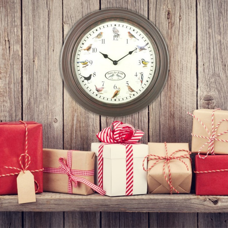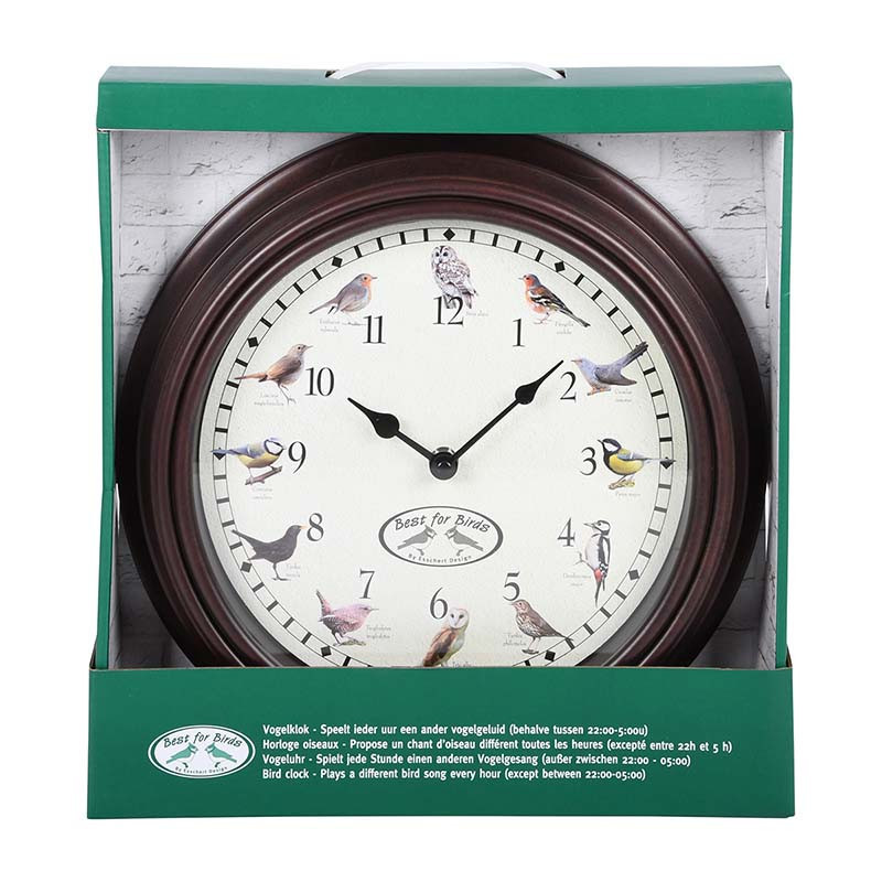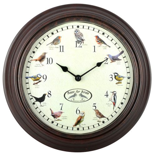 Különleges, madárhangokon megszólaló óra, mely minden órában más madár hangján jelzi az óra egészet. Helyezd a kertedbe vagy a lakásodba és élvezd minden órába a változatos madár hangokat. 12 madárhangon szólal meg az óra: erdei pinty, kakukk, széncinege, nagy fakopáncs, énekes rigó, gyöngybagoly, ökörszem, fekete rigó, kék cinege, fülemüle, vörösbegy és macskabagoly. Az óra 3 ceruzaelemmel működik, egy elem az óraműt, kettő pedig a hangokat működteti, így ha nem szeretnéd hogy szóljon az óra, akkor nem kell elemet rakni a madárhangokért felelős tartóba. Az elemek nem tartozékai a terméknek. Idő beállítása: Állítsd az órát a megfelelő időhöz. A madárhangok, ha be van kapcsolva, 22 és 5 óra között nem szólalnak meg. Nyári időszámítás: óraátállítás során mindig előre tekerd az órákat (nyáriról téli időszámítás során előre állítunk 23 órát – téliről nyári időszámítás során előre állítunk 1 órát), hiszen ha visszafele tekered a mutatókat, azzal megzavarhatod a madárhangokat. Madárhangok beállítása: a madárhangokat a hangszóró melletti kerek gombbal állíthatod be. Állítsd az órát 5 perccel egész óra elé, és addig nyomd a kerek gombot a hangszóró mellett, amíg a megfelelő hangot nem hallod az egész óra mutatójánál. (Ajánljuk a huhogó kakukk hangját kiindulási pontnak 2 óránál, a könnyű felismerés miatt.) Figyelj arra, hogy az óra 22 és 5 óra között nem ad ki hangot, így lehet, hogy kétszer kell végignyomni, hogy a megfelelő hangot be tud állítani.
