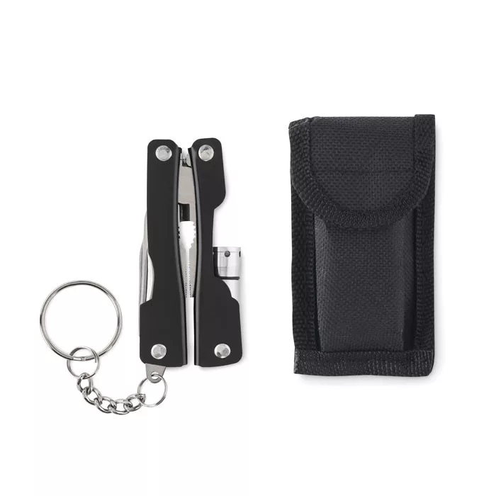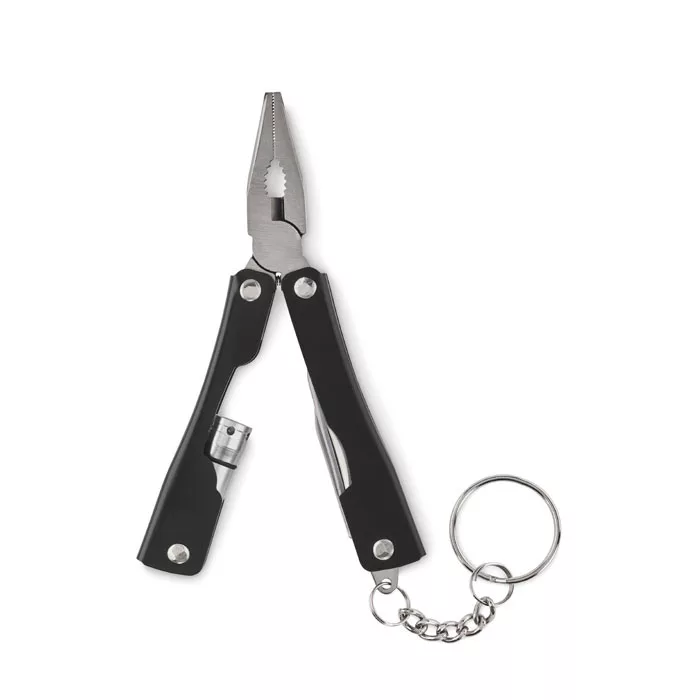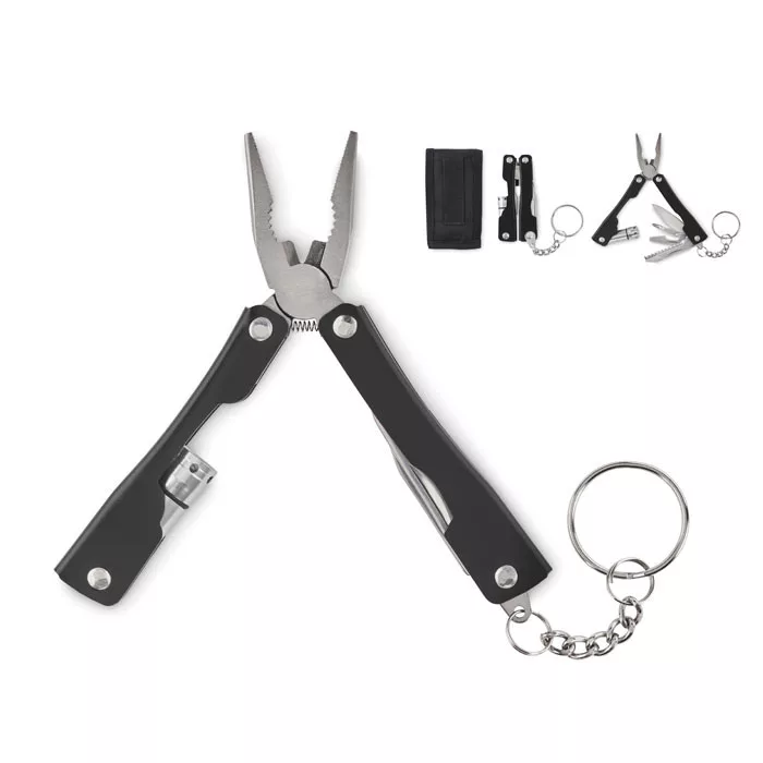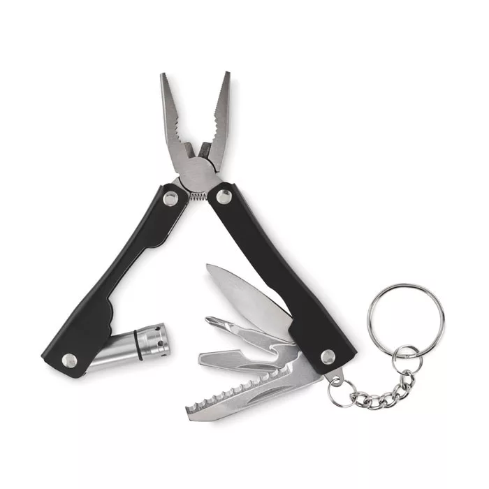 Összecsukható multifunkciós szerszám zseblámpával, rozsdamentes acélból. 10 szerszám funkcióval, 600D poliészter tokban. A működéshez szükséges 3 db AG3 gombelemmel szállítjuk.