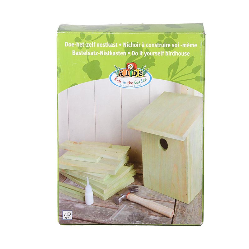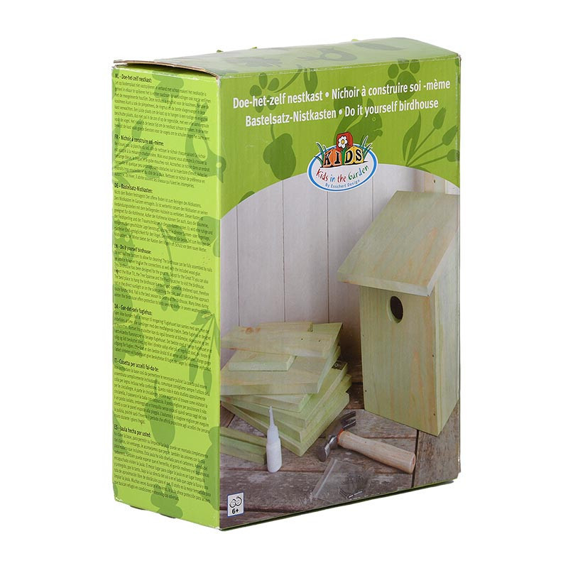 Összeszerelhető madárház. A szett tartalmazza a ház elemeit (oldalfalak, tető, alja), melyek zöldre vannak pácolva, valamint egy kis kalapácsot, szögeket, ragasztót az összeszereléshez. A madárházat kompletten össze lehet szerelni szögekkel, mi azonban tanácsoljuk, hogy egy kicsit ragasszuk össze a részeket a dobozban található faragasztóval is. Ne szögezzük oda az alját, hogy időnként tisztítani lehessen. A madárház alapvetően a cinegéknek lett tervezve. Rajta kívül lakóként vagy látogatóként számíthatunk kék cinegére, mezei verébre és kormos légykapóra is. A legjobb ötlet a madárház elhelyezésére egy szabad és valamennyire védett és nyugodt hely. Ne rakjuk tűző napra vagy olyan helyre, ahol éri az eső vagy bármilyen akadály, ami gátolja a madarak hozzáférését. Ősz a legjobb időszak a madárház kitisztítására, hiszen a téli időszakban a madarak különösen keresik a menedéket a hideg idő elől menekülve.