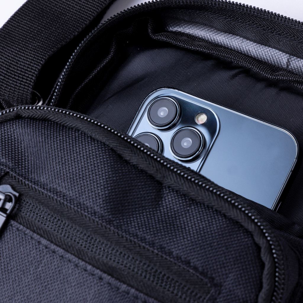 RPET válltáska cipzáras rekeszekkel és állítható vállpánttal. 600D RPET poliészter, megkülönböztető RPET címkével.