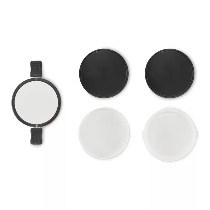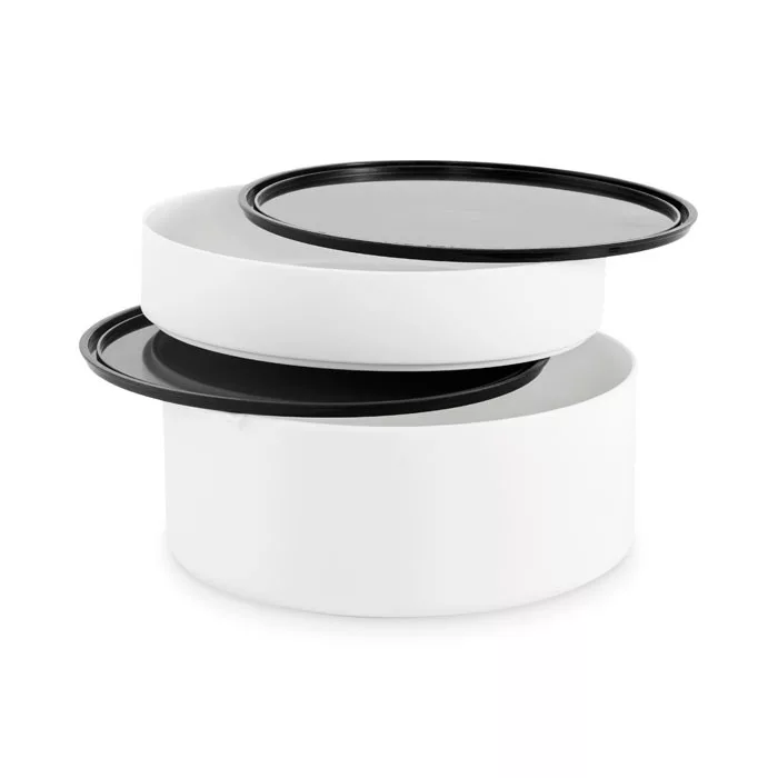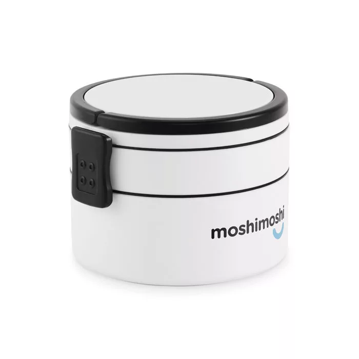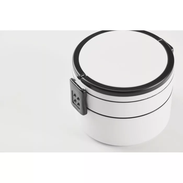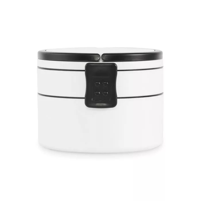 Két szintes, kerek ételtartó uzsonnásdoboz PP anyagból, oldalsó csatos záródással és fogantyúkkal. Belső fedelekkel.