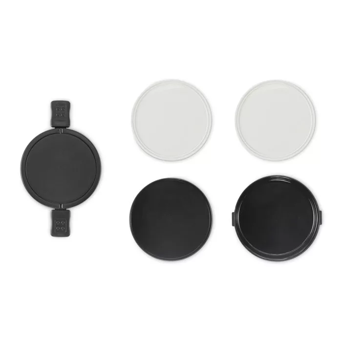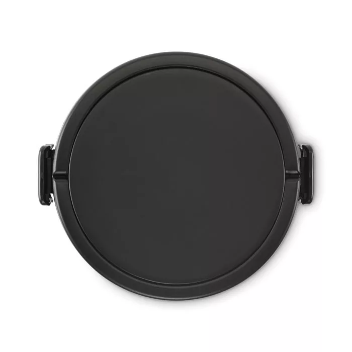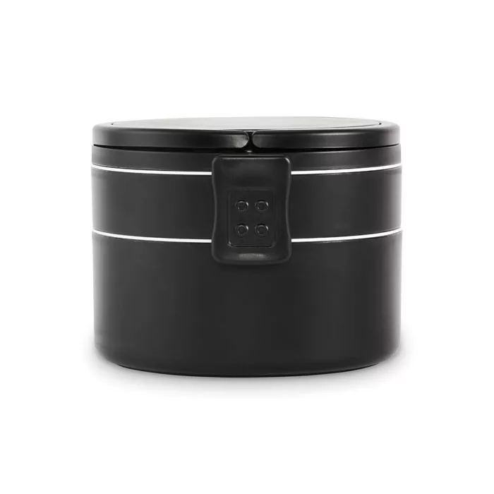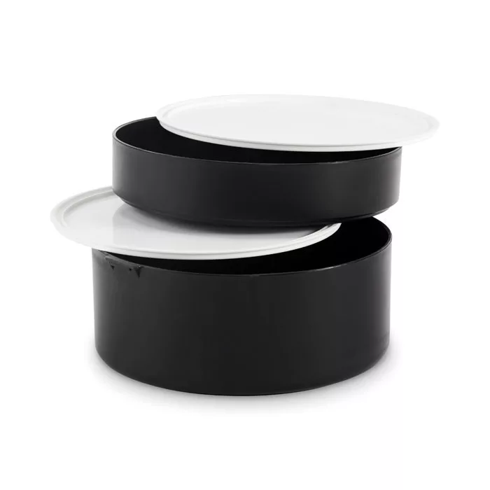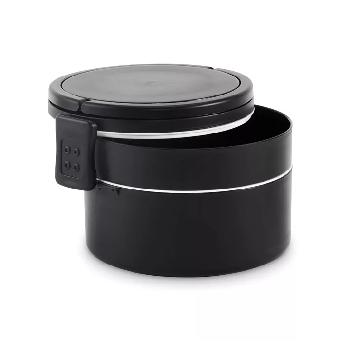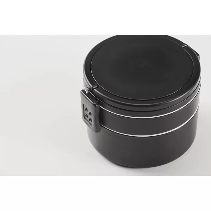 Két szintes, kerek ételtartó uzsonnásdoboz PP anyagból, oldalsó csatos záródással és fogantyúkkal. Belső fedelekkel.