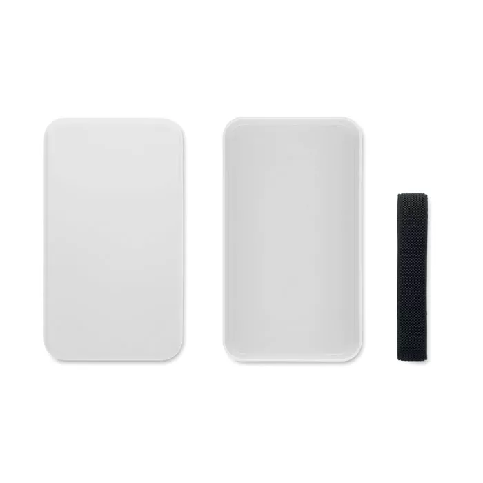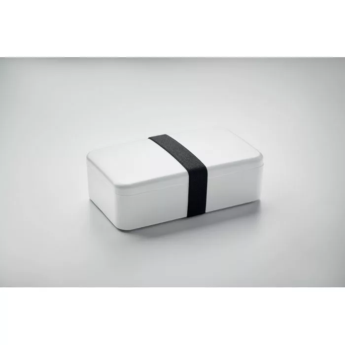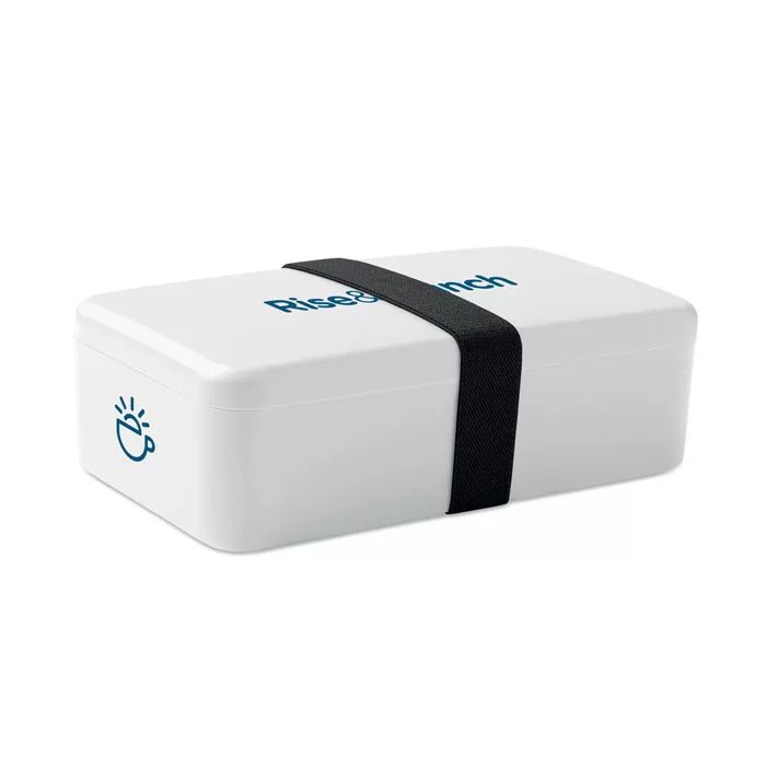 Uzsonnás- vagy ételtartó doboz PP-ből, RPET elasztikus rögzítőpánttal. Űrtartalom: 750 ml.
