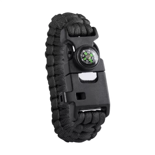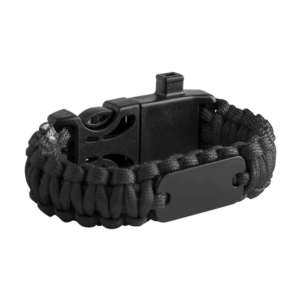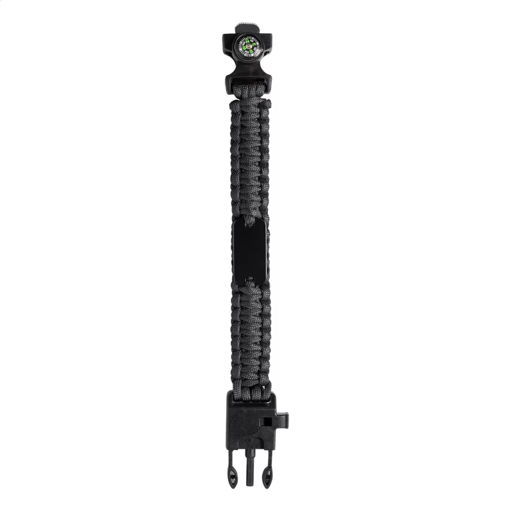 Többfunkciós túlélési karkötő iránytűvel, síppal és kovaköves tűzgyújtóval.