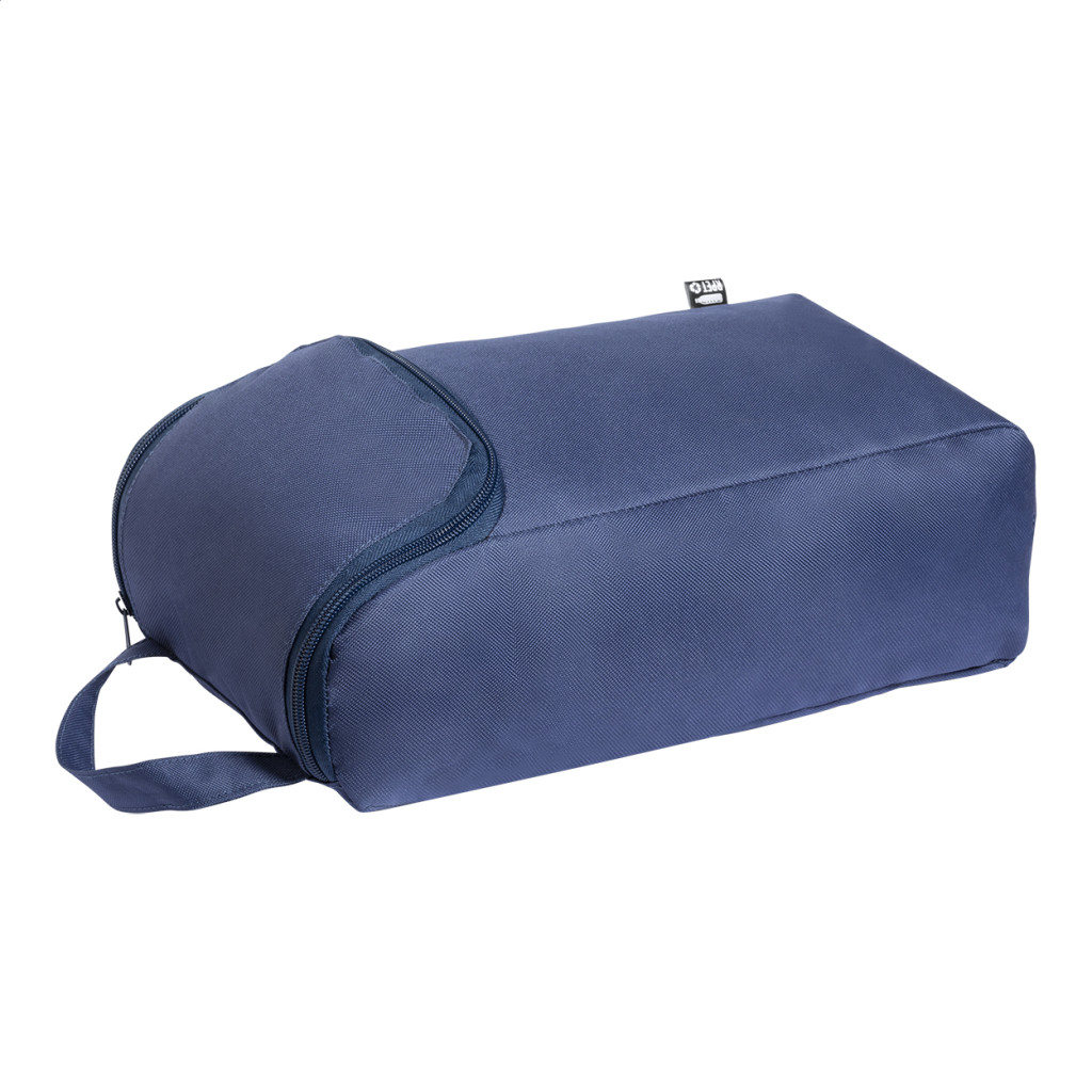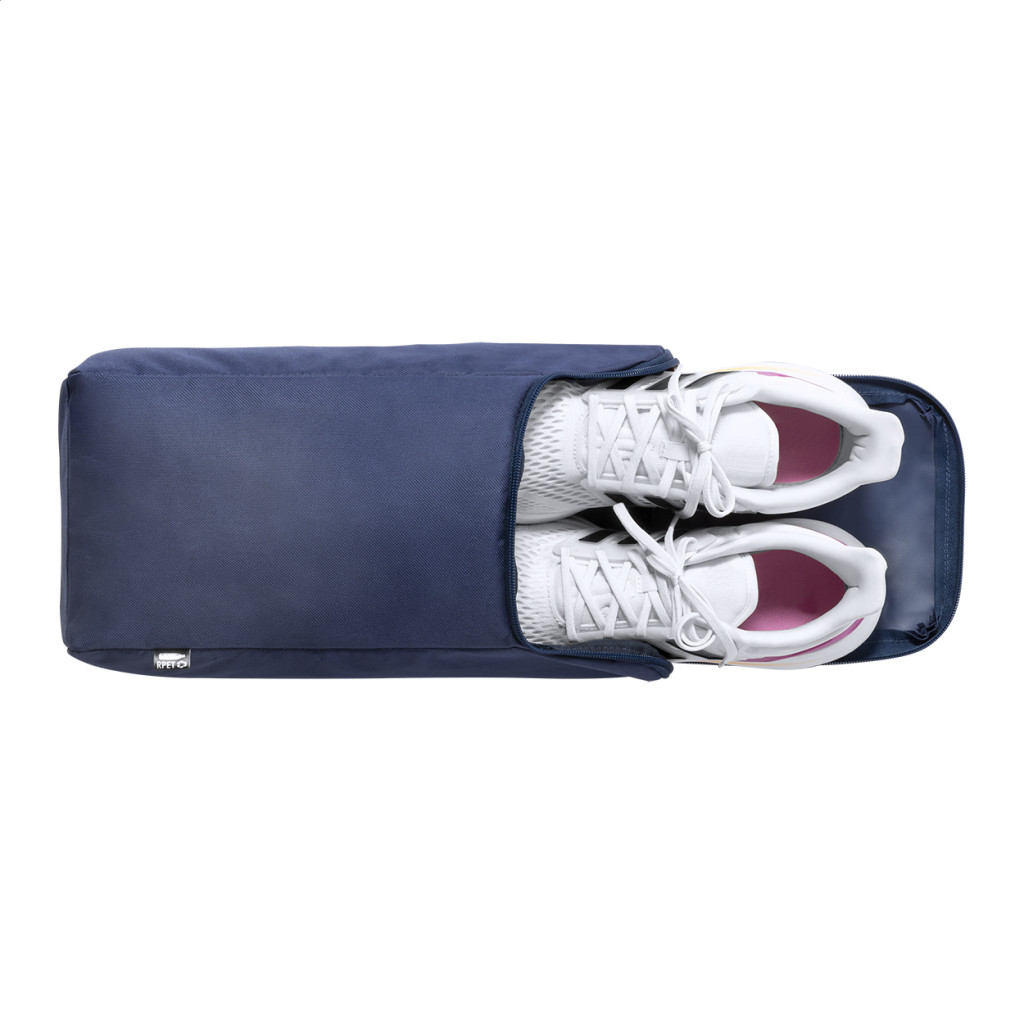 Cipzáras, 600D RPET poliészterből készült táska egy pár cipőhöz, megkülönböztető RPET címkével.