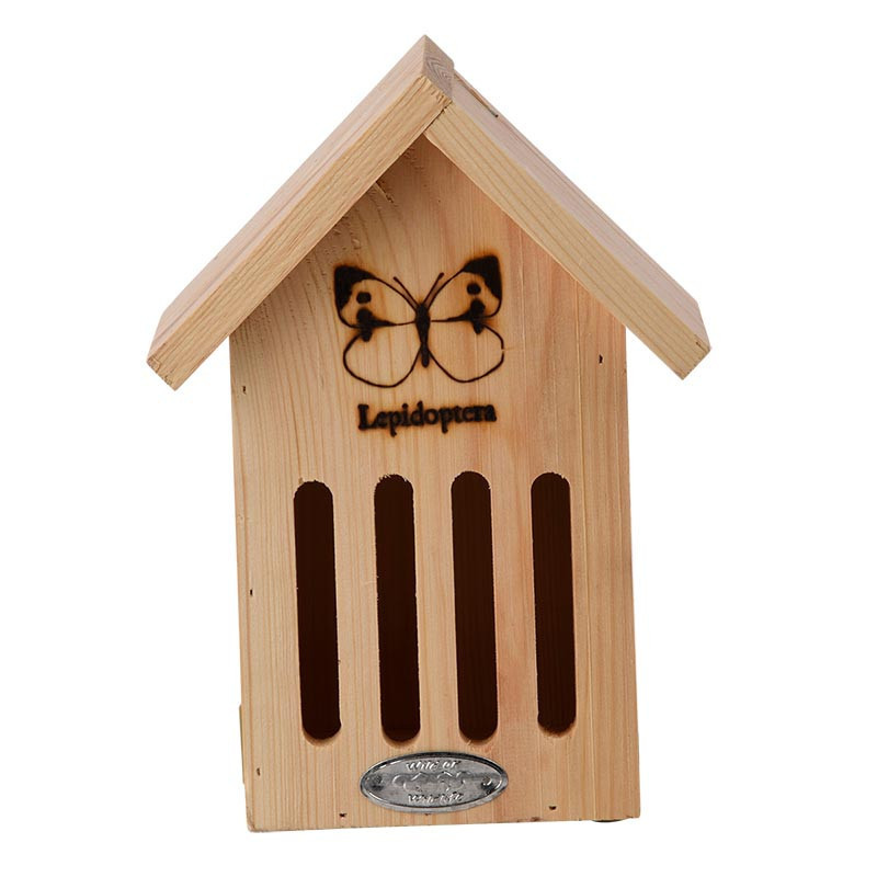 Pillangó ház pillangó mintával. A gyönyörű, napsütéses, nyári napokon mindenfelé pillangót láthatsz. A hűvösebb időben azonban mindig elrejtőznek. Ez a ház ideális hely pillangók számára, hogy a hűvös és nyirkos időben menedéket nyújtson. Ha a pillangók kedvére tennénk, helyezzünk gallyakat a pillangóházba. A pillangók szívesen időznek rajta, miközben bent vannak.