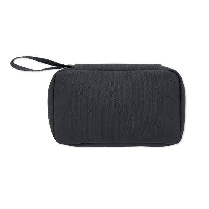 Pipere táska 600D RPET anyagból, PU bevonattal, RPET hálóval és 210D RPET béléssel. Elülső cipzáras főrekesszel, belső hálós és nyitott zsebekkel.