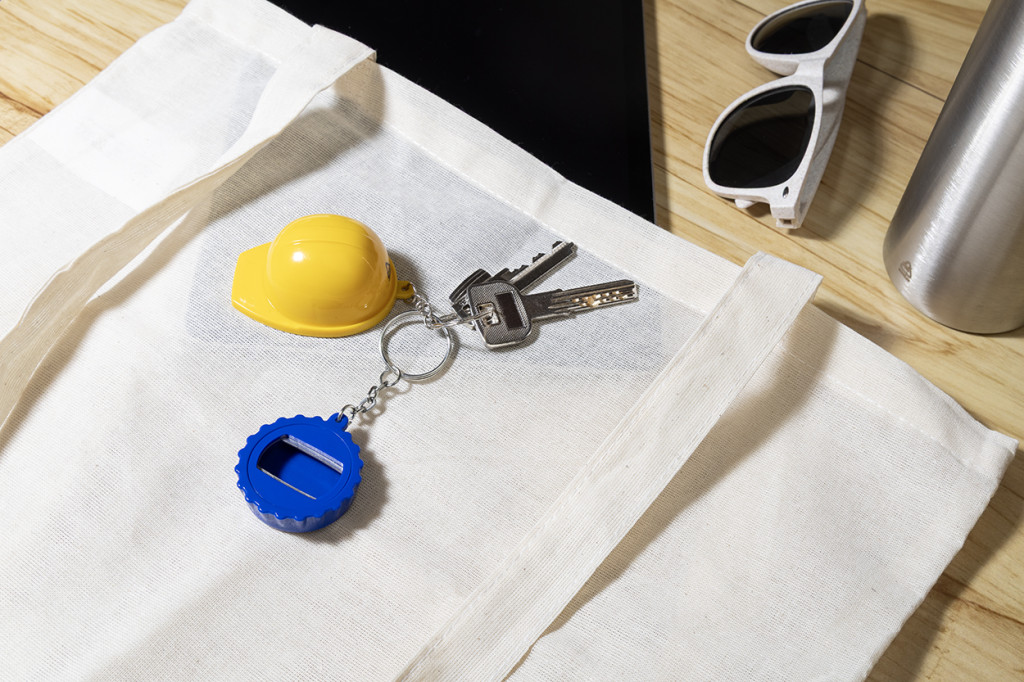 Újrahasznosított ABS műanyagból készült, kupak alakú kulcstartó üvegnyitóval.