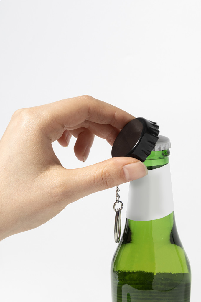 Újrahasznosított ABS műanyagból készült, kupak alakú kulcstartó üvegnyitóval.