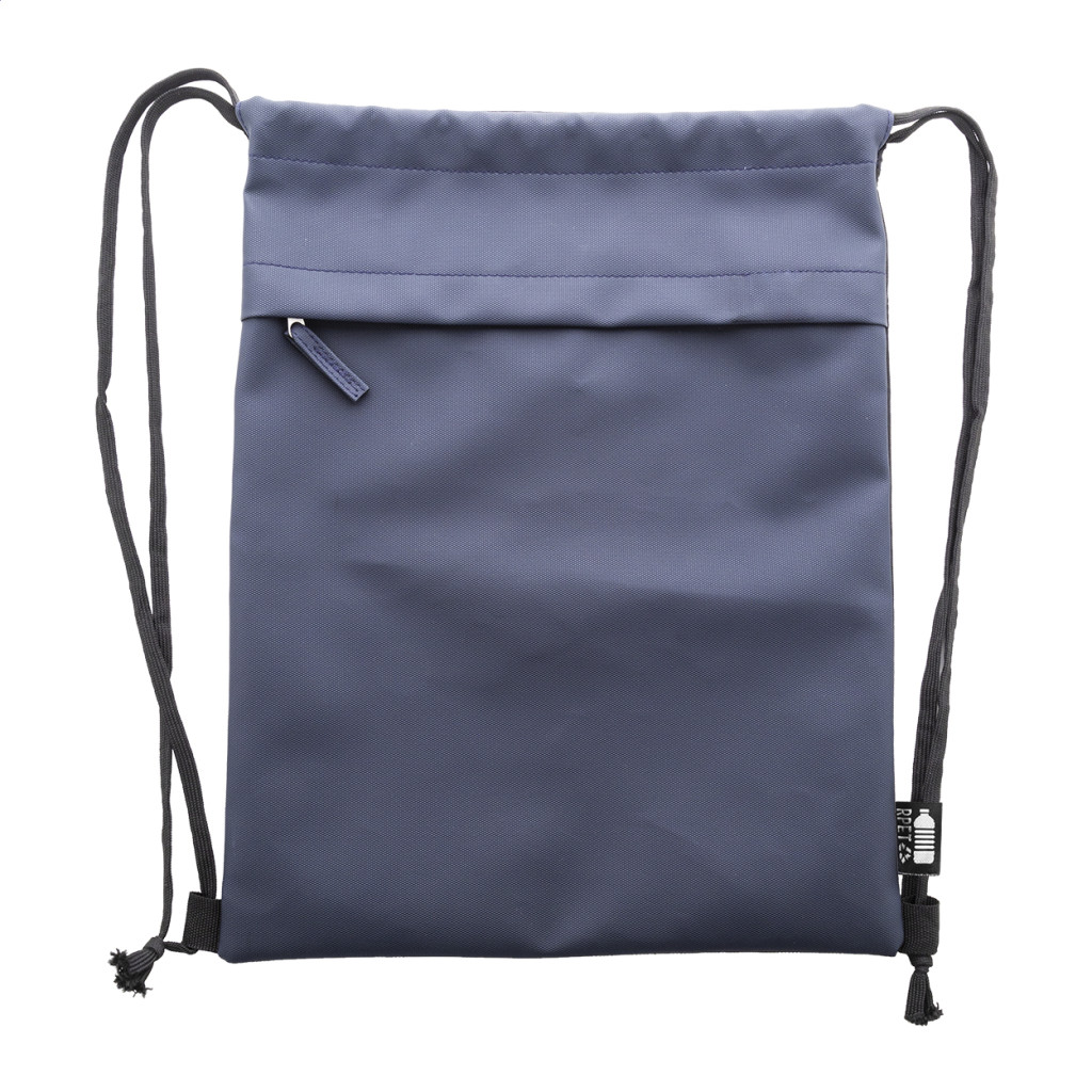 RPET zsinóros hátizsák, az elülső oldalán műbőr bevonatú cipzáras zsebbel. Műbőr bevonatú 600D RPET poliészterből, megkülönböztető RPET címkével.