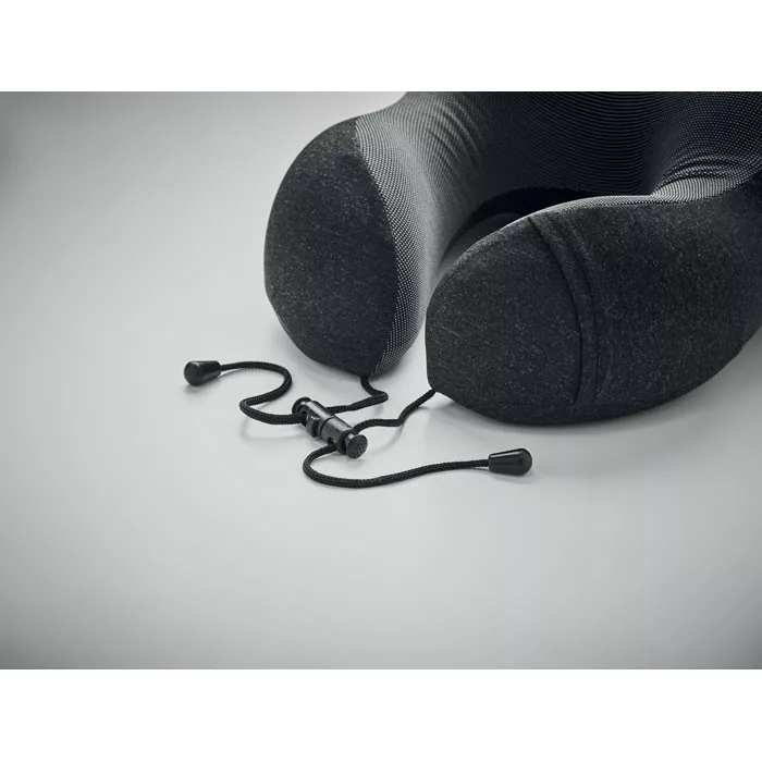 Nyakpárna utazáshoz kationos szövetből. Húzózsinóros, RPET poliészter hordtáskában. Autós, vonatos vagy repülős utazások népszerű kiegészítője.