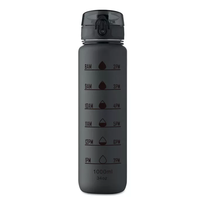 Sportkulacs RPET-ből, motivációs időjelzéssel, egy kézzel nyitható, felpattintható fedéllel, biztonsági zárral és hordfüllel.