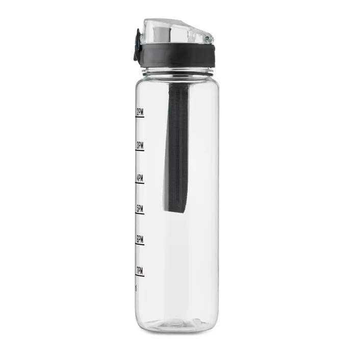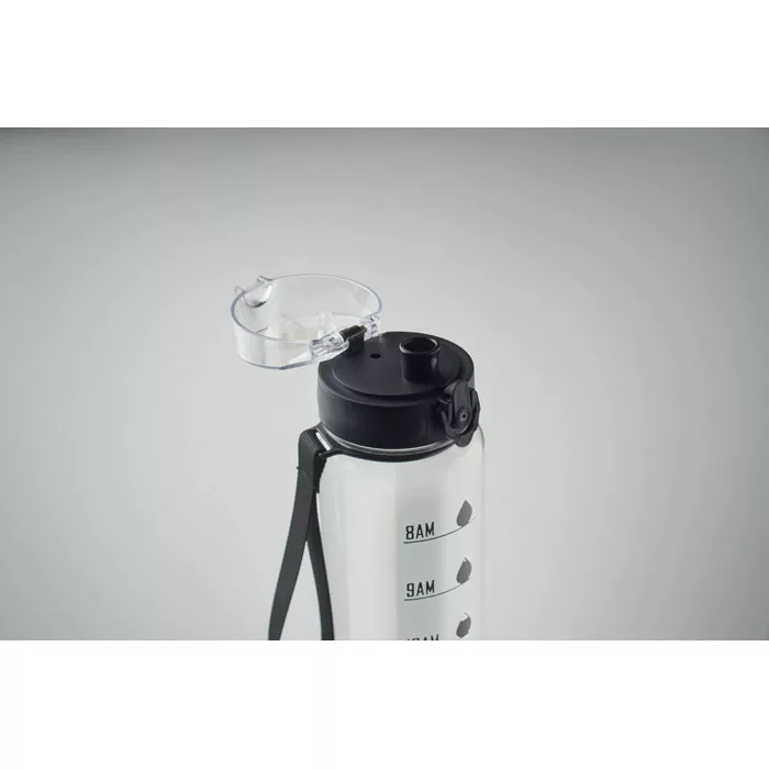 Sportkulacs RPET-ből, motivációs időjelzéssel, egy kézzel nyitható, felpattintható fedéllel, biztonsági zárral és hordfüllel.