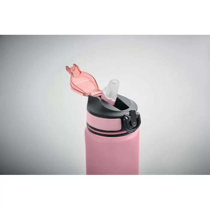 Sportkulacs RPET-ből, beépített szívószállal, puha szilikon ivórésszel, motivációs időjelzéssel, egy kézzel nyitható, felpattintható fedéllel, biztonsági zárral és hordszíjjal. Szivárgásmentes. Űrtartalom: 1 liter.