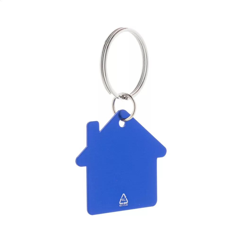 Ház alakú, újrahasznosított alumínium kulcstartó fém karikával.