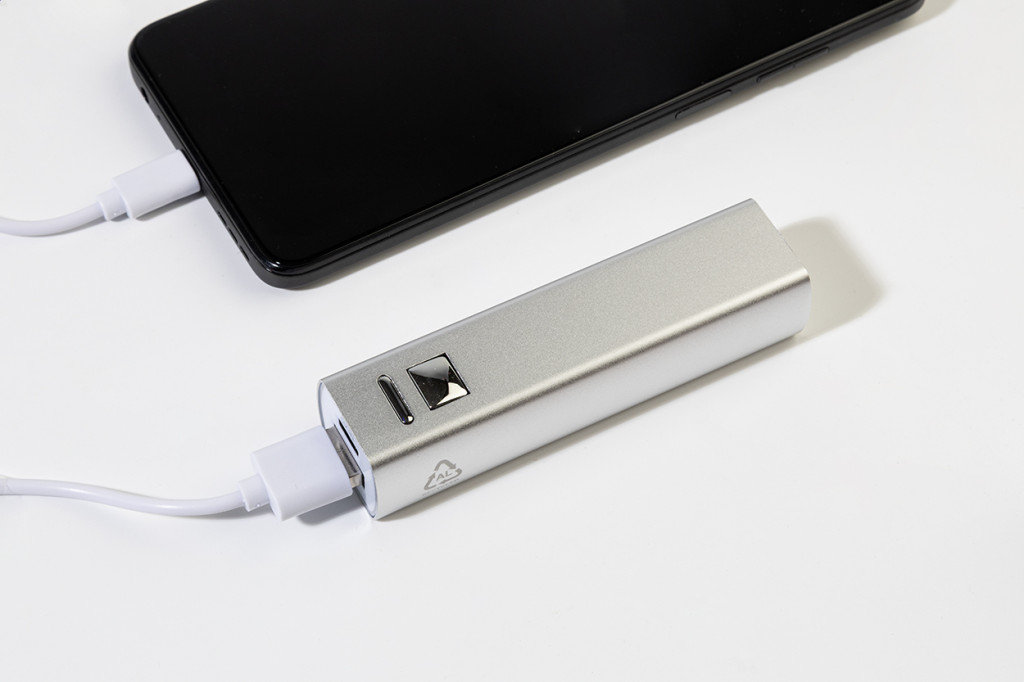 Újrahasznosított alumínium power bank 2600 mAh akkumulátorral. 1 USB és 1 USB-C töltőporttal. USB-C bemeneti porttal. USB töltőkábellel szállítjuk.