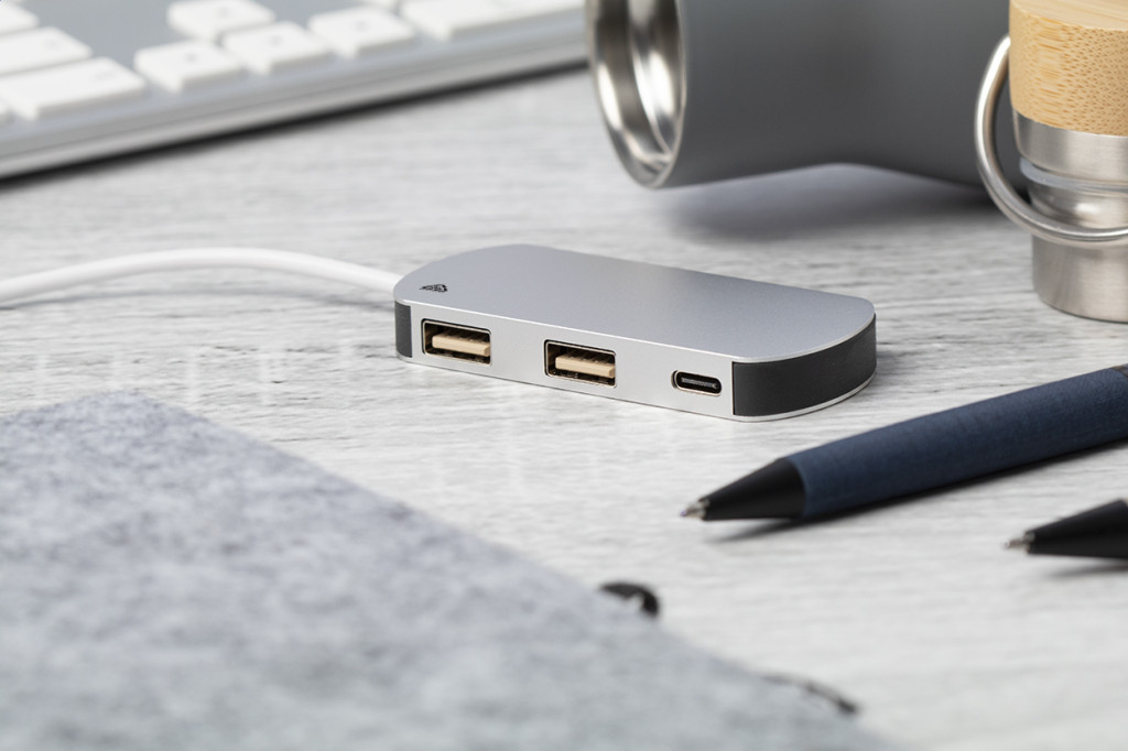 Újrahasznosított alumínium és újrahasznosított ABS műanyag USB hub 2 USB és 1 USB-C porttal, USB 2.0. USB és USB-C csatlakozású kábellel szállítjuk.