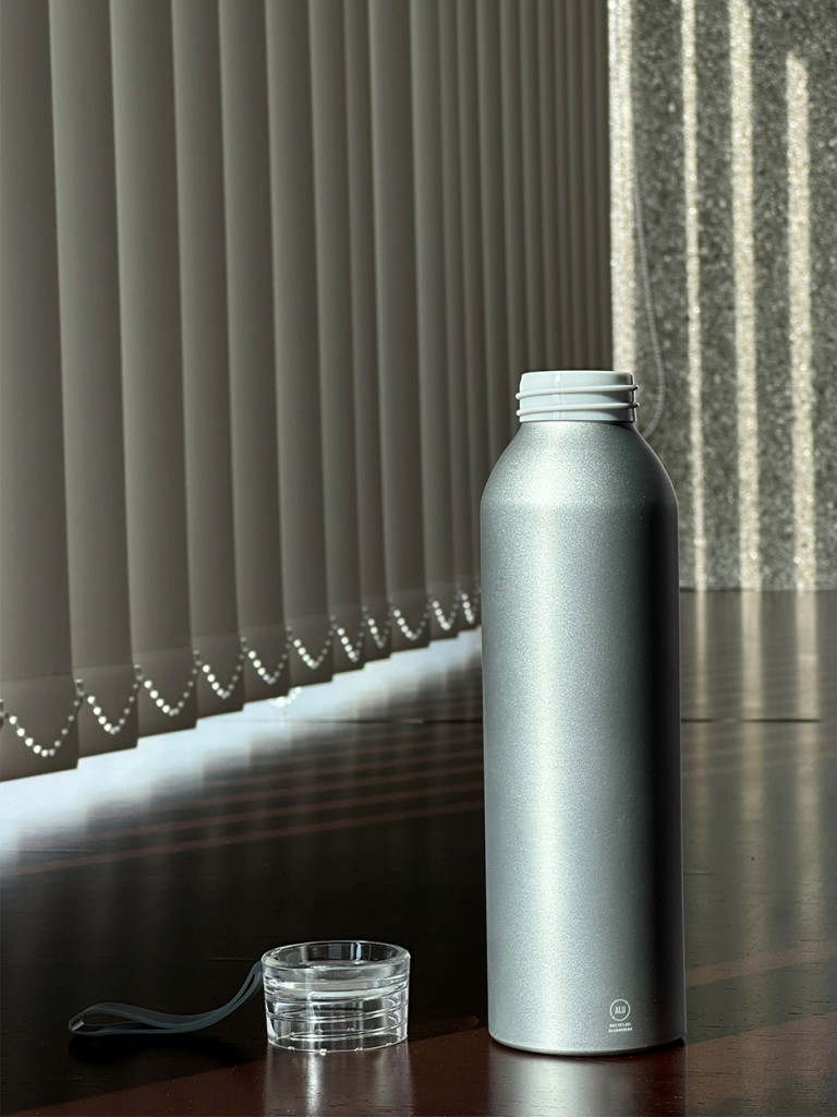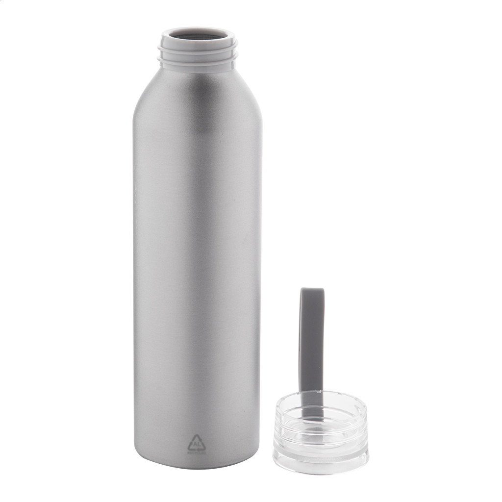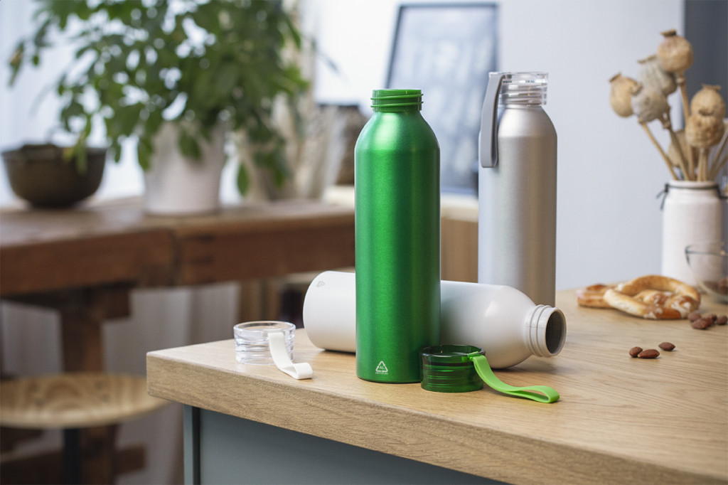 Újrahasznosított alumínium kulacs hozzáillő színű kupakkal és szilikon hordszíjjal, 600 ml.
