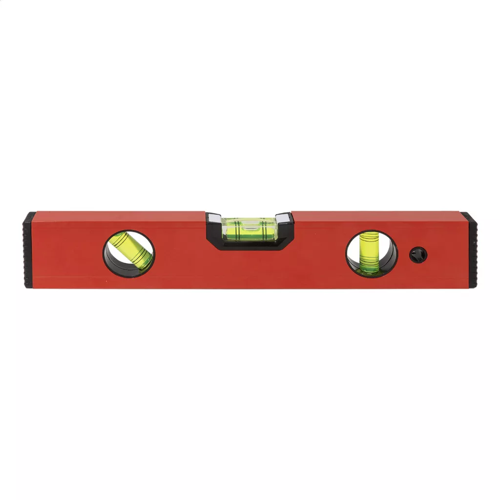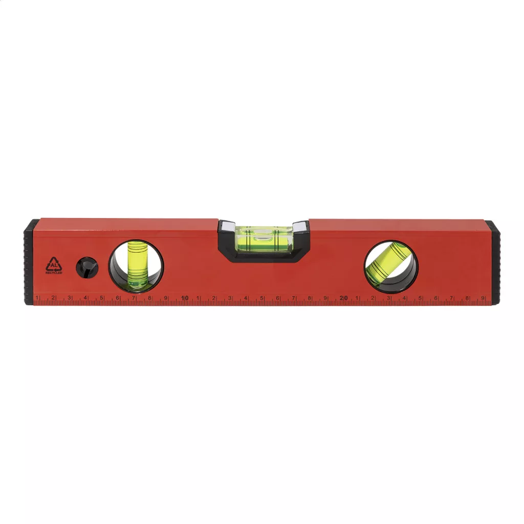 Mágneses vízmérték újrahasznosított alumíniumból, három vízmértékkel (vízszintes, függőleges és 45°-os) és 30 cm-es vonalzóval.
