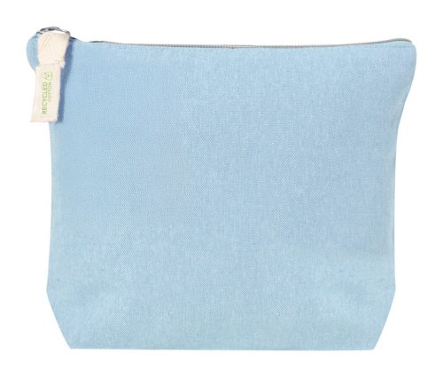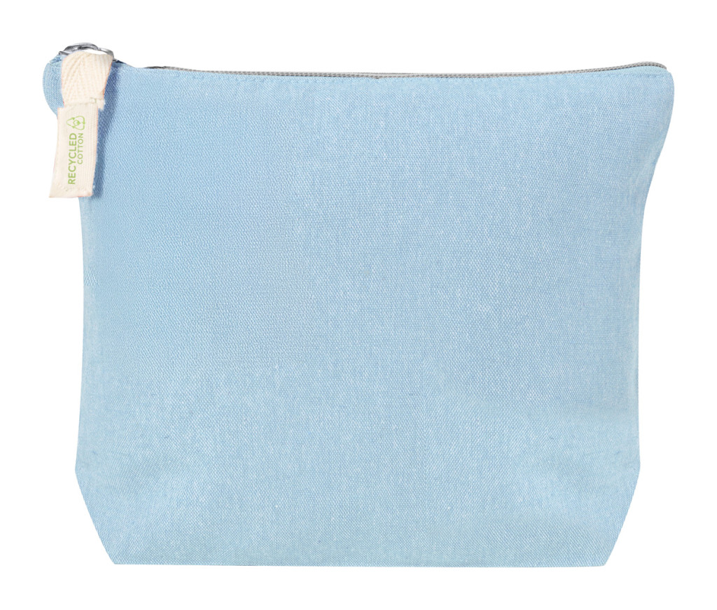 Újrahasznosított pamutból készült, cipzáras kozmetikai táska, megkülönböztető újrahasznosított pamut címkével.