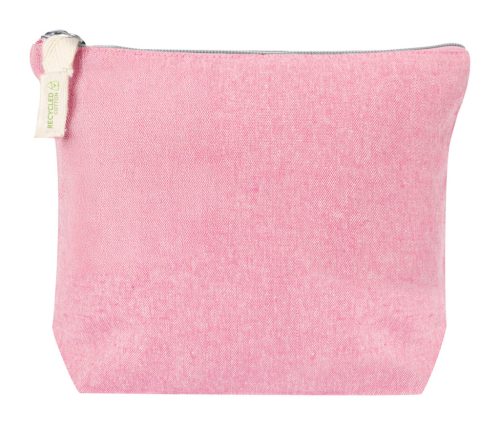 Újrahasznosított pamutból készült, cipzáras kozmetikai táska, megkülönböztető újrahasznosított pamut címkével.