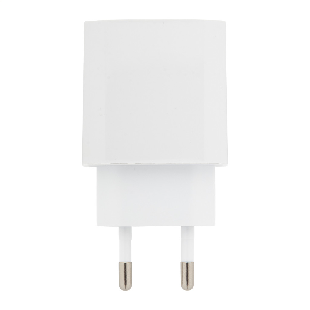 Újrahasznosított ABS műanyag fali gyorstöltő 1 USB és 1 UBS-C porttal. Gyorstöltő technológiával (PD20W / QC3.0) és 2 pólusú európai csatlakozóval.