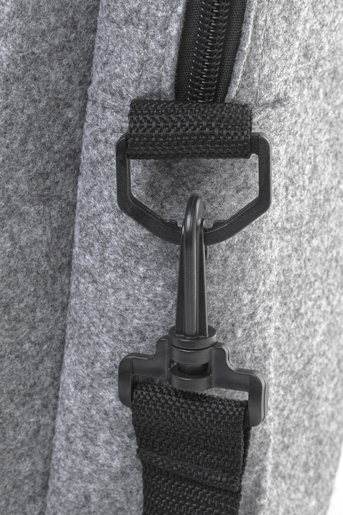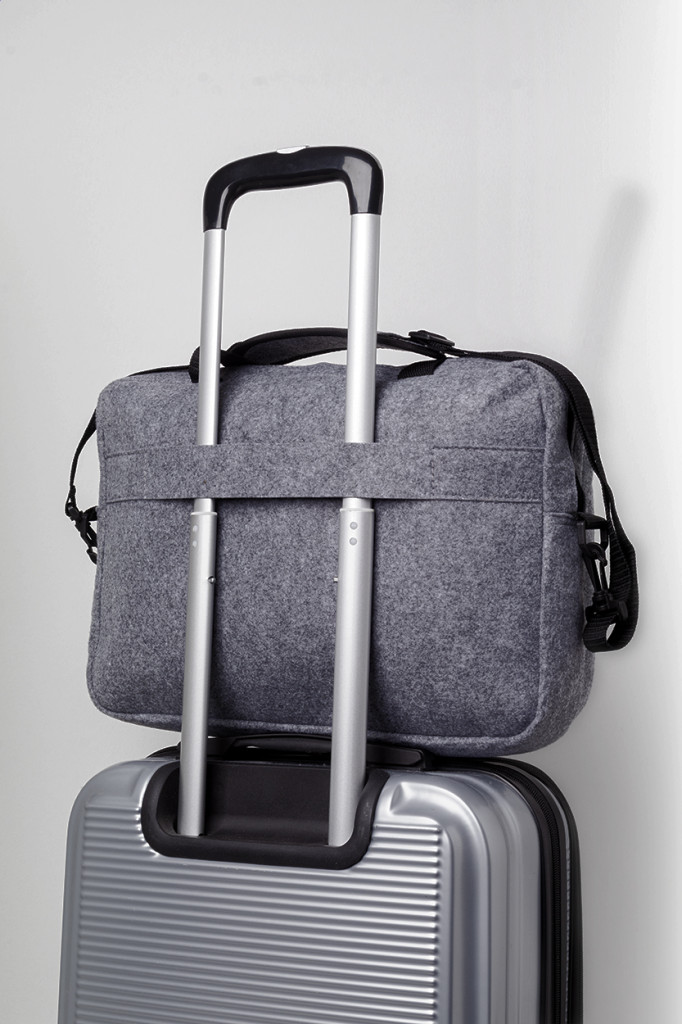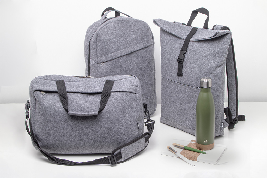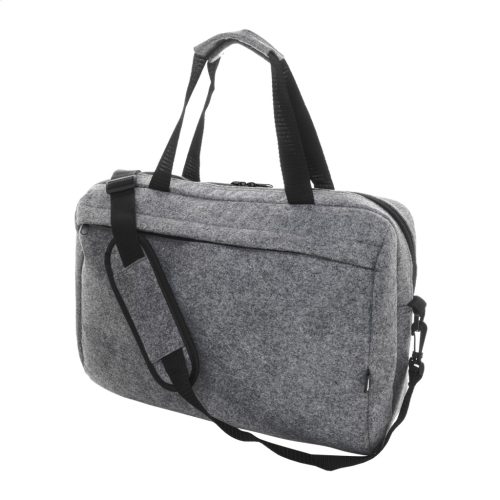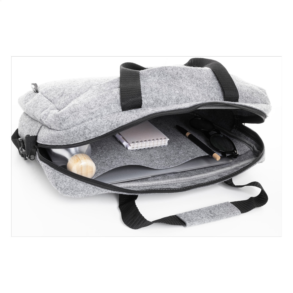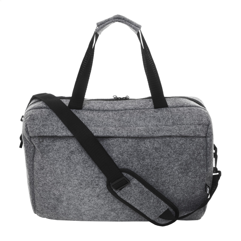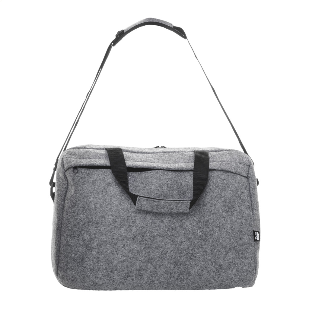 RPET filc irattáska cipzáras fő rekesszel és elülső zsebbel. Laptop rekesszel (15"), bőröndpánttal és állítható vállpánttal. Megkülönböztető RPET címkével.