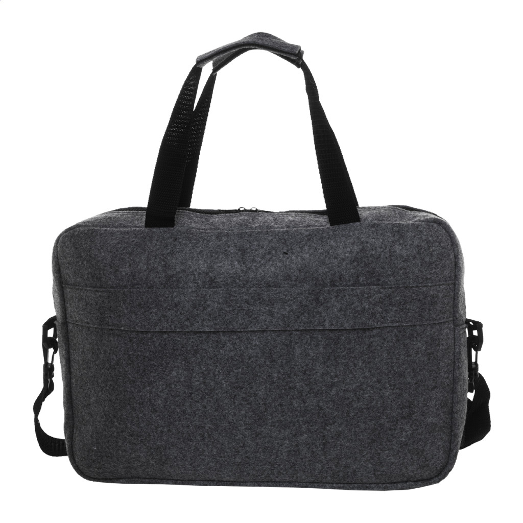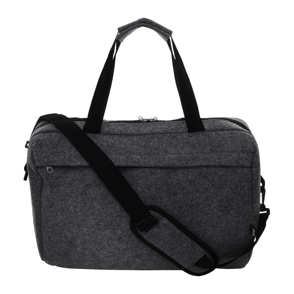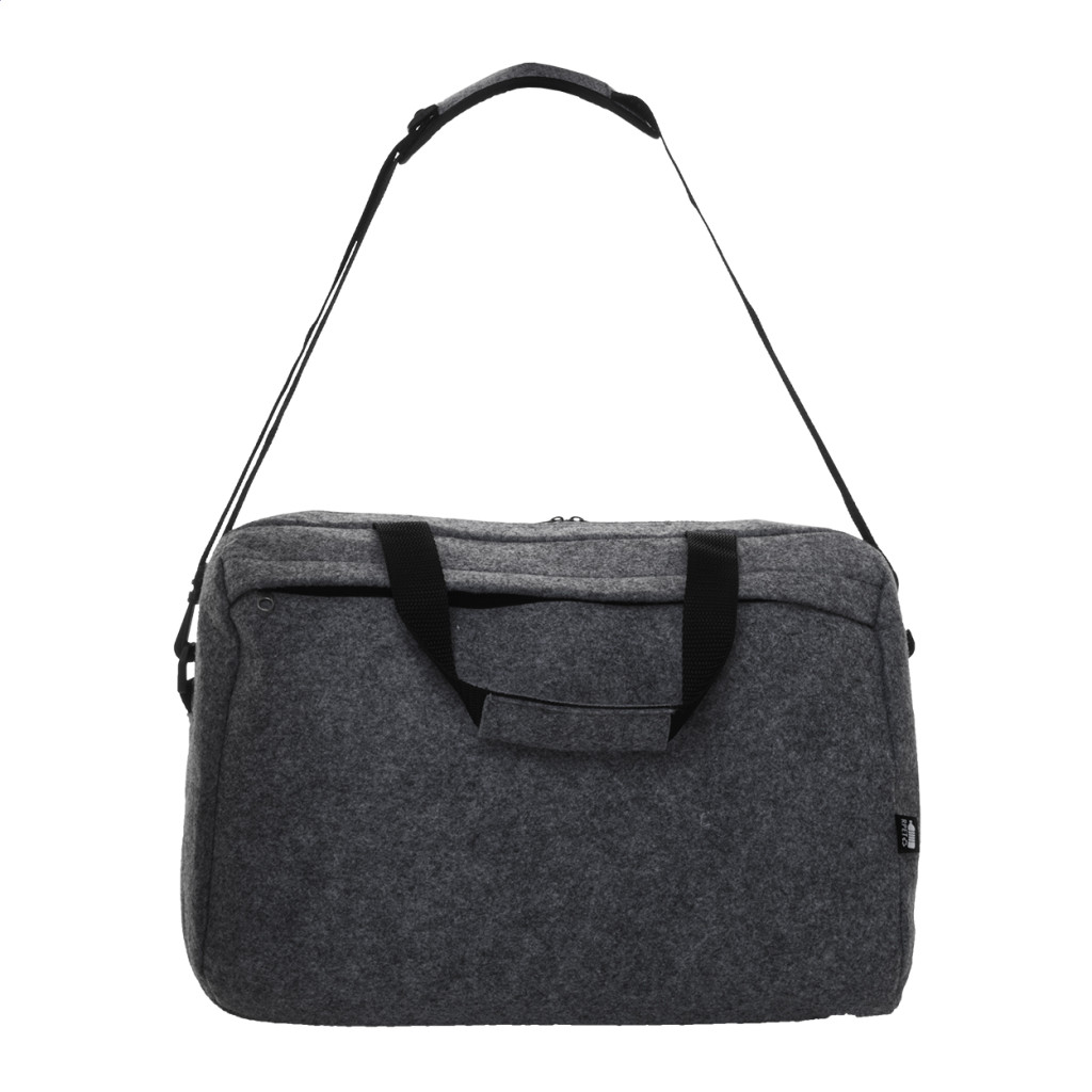 RPET filc irattáska cipzáras fő rekesszel és elülső zsebbel. Laptop rekesszel (15"), bőröndpánttal és állítható vállpánttal. Megkülönböztető RPET címkével.