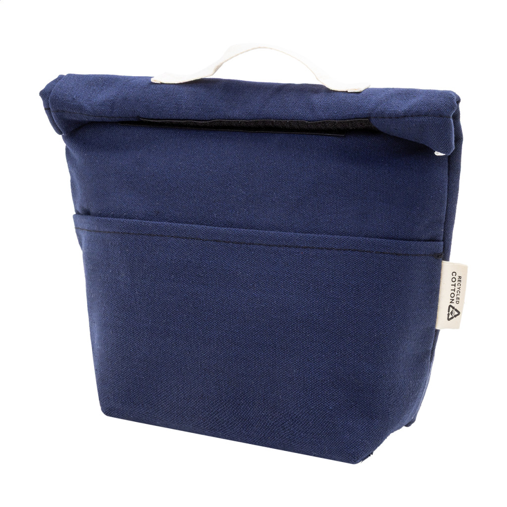 Újrahasznosított vászonból készült, feltekerhető hűtőtáska elülső zsebbel, alumínium béléssel és tépőzárral. 70% újrahasznosított pamut és 30% RPET poliészter. Megkülönböztető újrahasznosított pamut címkével.