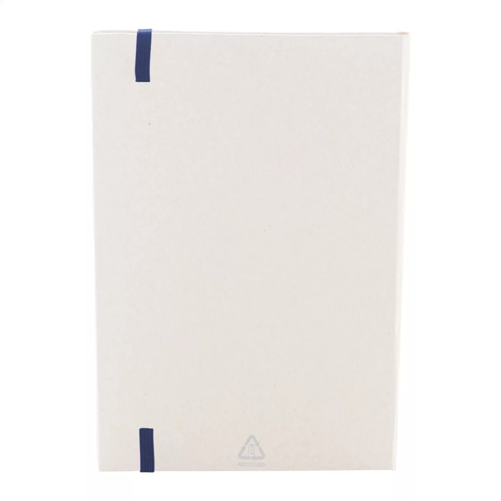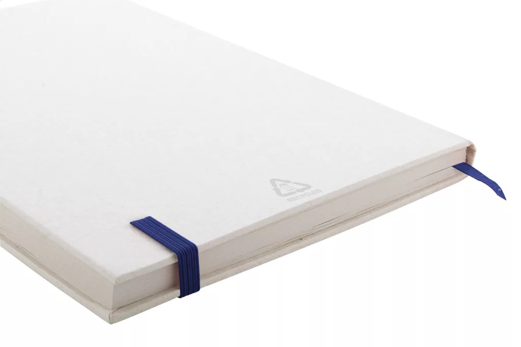 Újrahasznosított tejesdoboz anyagú jegyzetfüzet kemény borítóval és 80 vonalas lappal. Hozzáillő színű gumiszalaggal. A5 méretű.