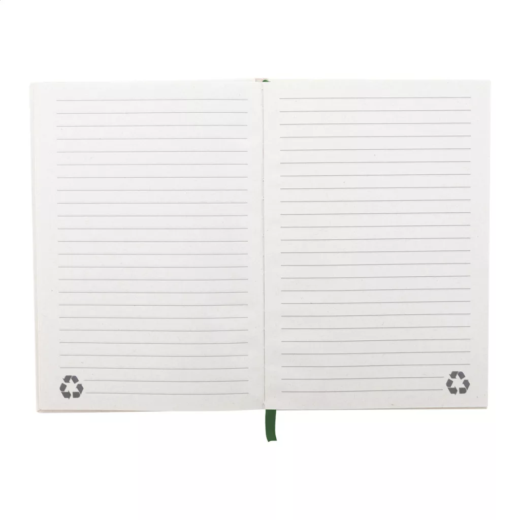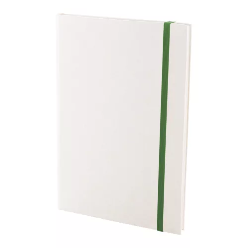 Újrahasznosított tejesdoboz anyagú jegyzetfüzet kemény borítóval és 80 vonalas lappal. Hozzáillő színű gumiszalaggal. A5 méretű.