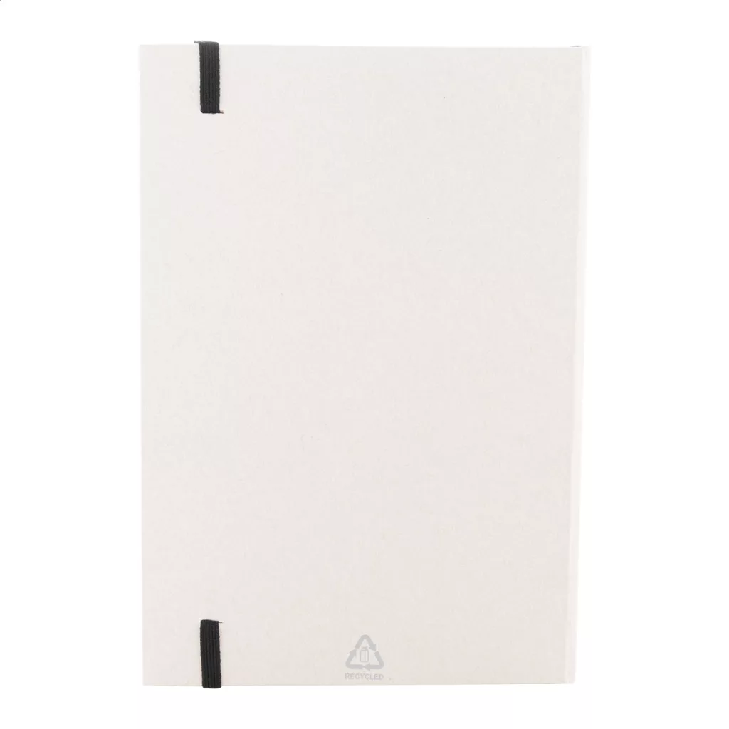 Újrahasznosított tejesdoboz anyagú jegyzetfüzet kemény borítóval és 80 vonalas lappal. Hozzáillő színű gumiszalaggal. A5 méretű.