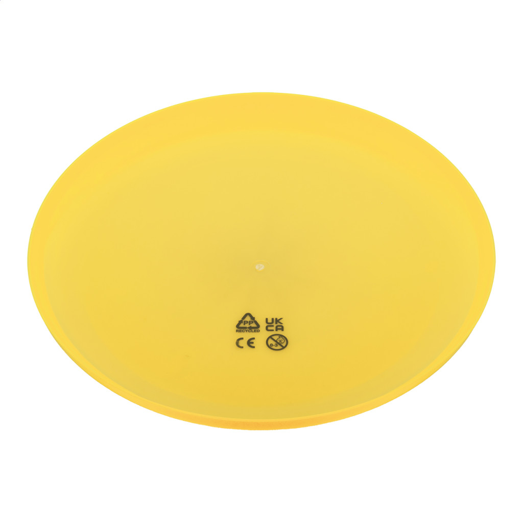 Újrahasznosított PP műanyag frizbi sima felülettel. Emblémázáshoz ideális.