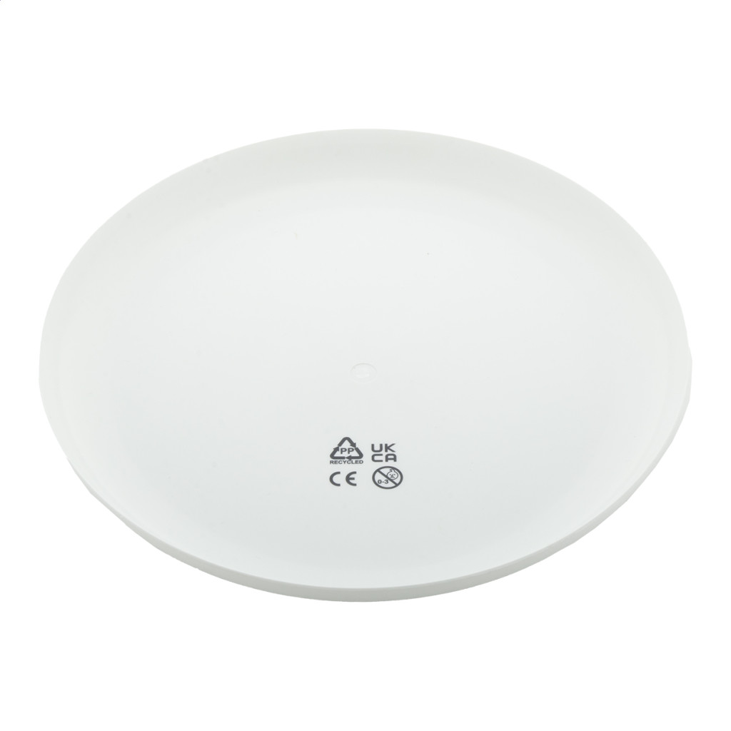 Újrahasznosított PP műanyag frizbi sima felülettel. Emblémázáshoz ideális.