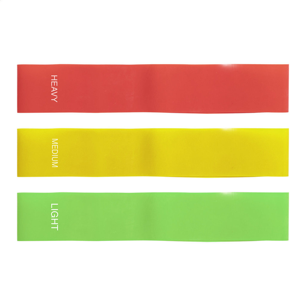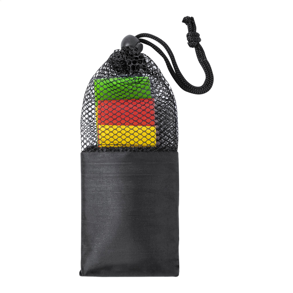 Fitness szalag szett 3 különböző ellenállásban (könnyű, közepes, nehéz) TPE gumiból. Húzózsinóros táskával.