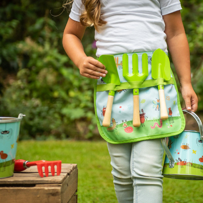 Rovar mintás gyerek szerszámos övtáska szett. Derékra csatolható kerti táska a legnélkülözhetetlenebb kerti szerszámokkal! A kedves állatminták garantáltan meghozzák a kedvet a legkisebbek számára is a kerti munkához! A színes táska állítható derékpánttal, strapabíró anyagból készült, így több éven keresztül örülhet neki kertbarát kis tulajdonosa. A kisméretű kézi ásó, a gereblye és a lapát sima, fából készült markolata tökéletesen illik a kis kezekbe, így igazi öröm lesz velük a kertészkedés! A markolat ökológiailag fenntartható, FSC minősítésű kitermelésből származó fából készült.