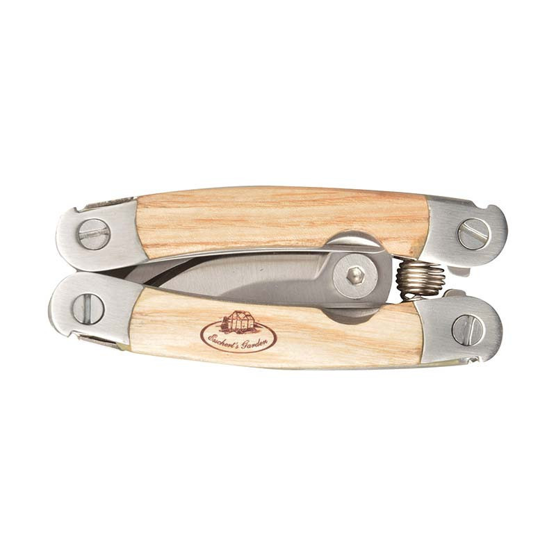 Rozsdamentes acélból készült többfunkciós szerszám. Ennek a kompakt, többfunkciós eszköznek a segítségével sokféle munkát elláthatunk a kertben és környékén. A termék 5 különböző szerszámot rejt magában: egy gyökerek eltávolítására szolgáló kampót, egy metsző kést, egy metszőollót, egy ültetőt és egy mini fűrészt. A szerszám anyaga rozsdamentes acél, kőrisfa markolattal. Kompakt, kicsi mérete lehetővé teszi, hogy bárhová könnyedén el tudd vinni és még a zsebedben is elfér. A terméket díszdobozba csomagolva szállítjuk, így akár ajándéknak is tökéletes választás.