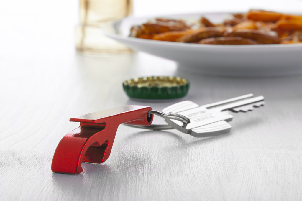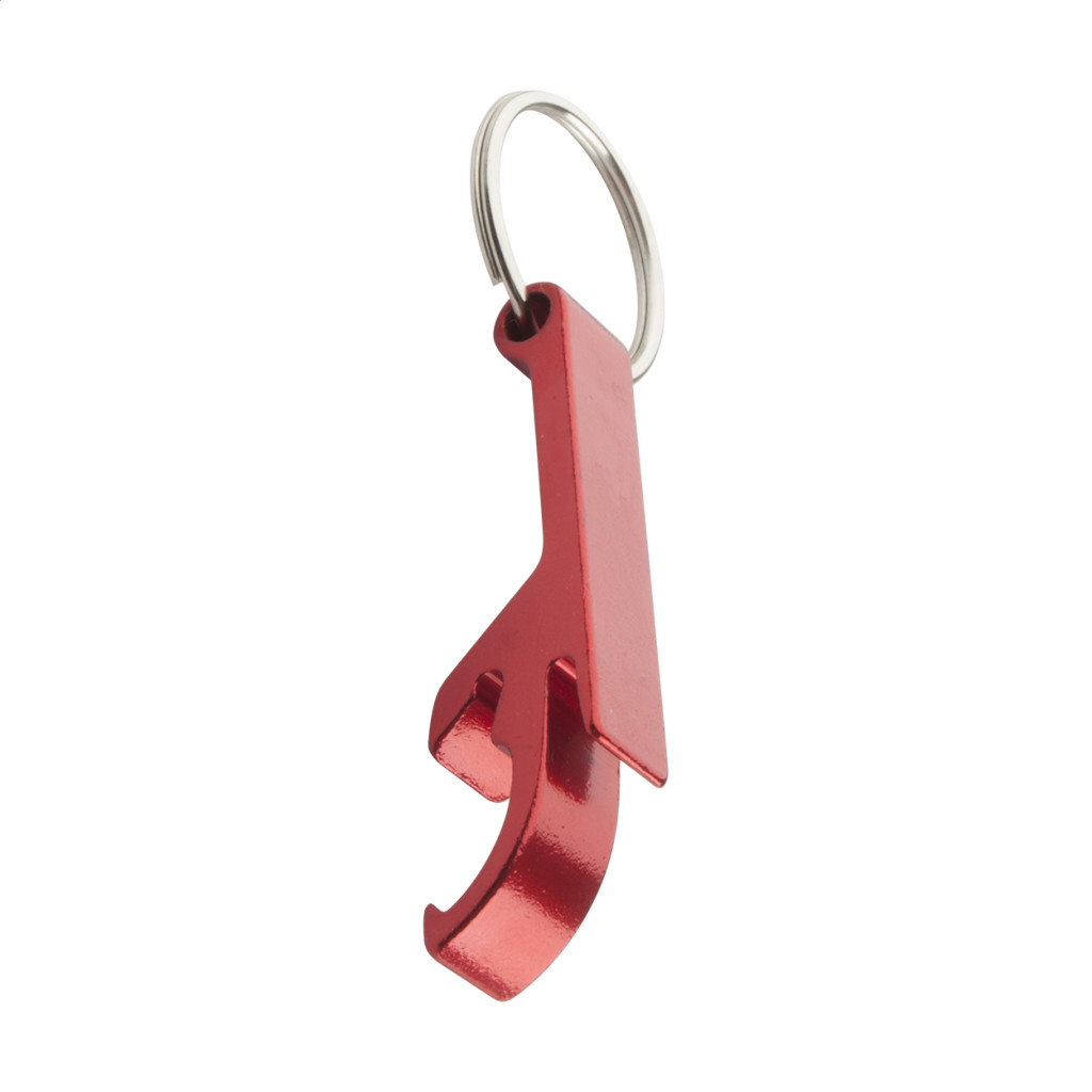 Alumíniumból készült üvegnyitó, kulcskarikával.