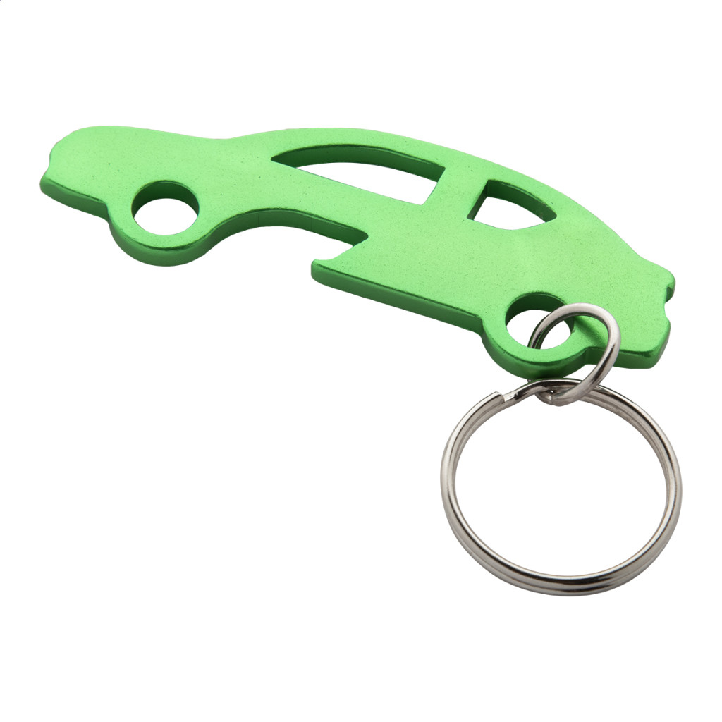 Alumíniumból készült, autó formájú kulcstartó üvegnyitó funkcióval.