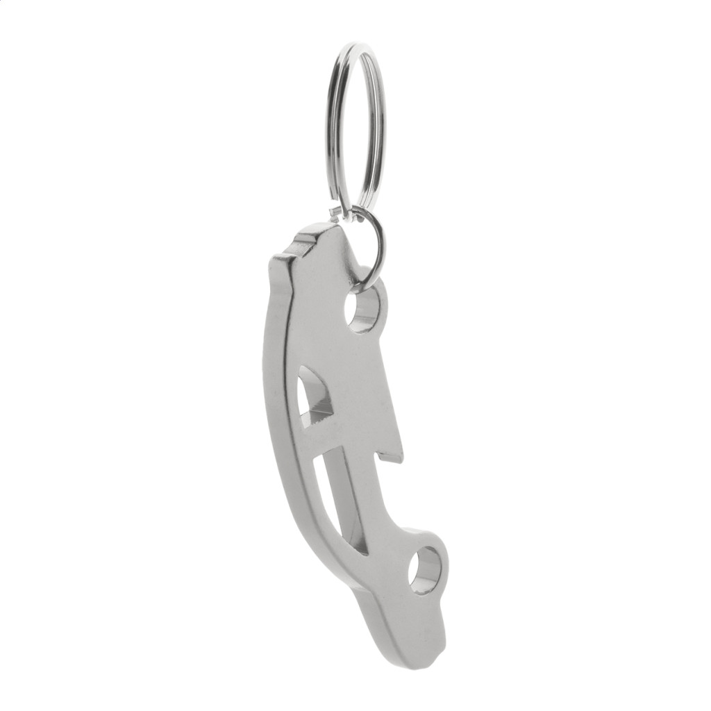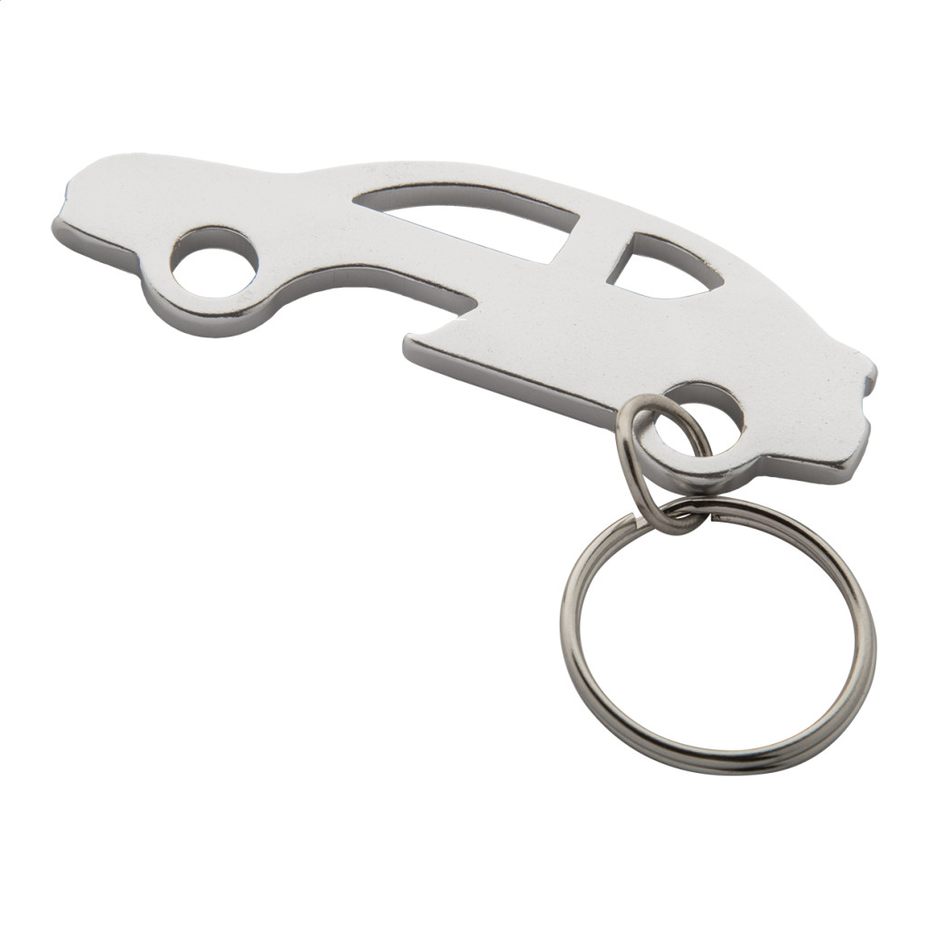 Alumíniumból készült, autó formájú kulcstartó üvegnyitó funkcióval.